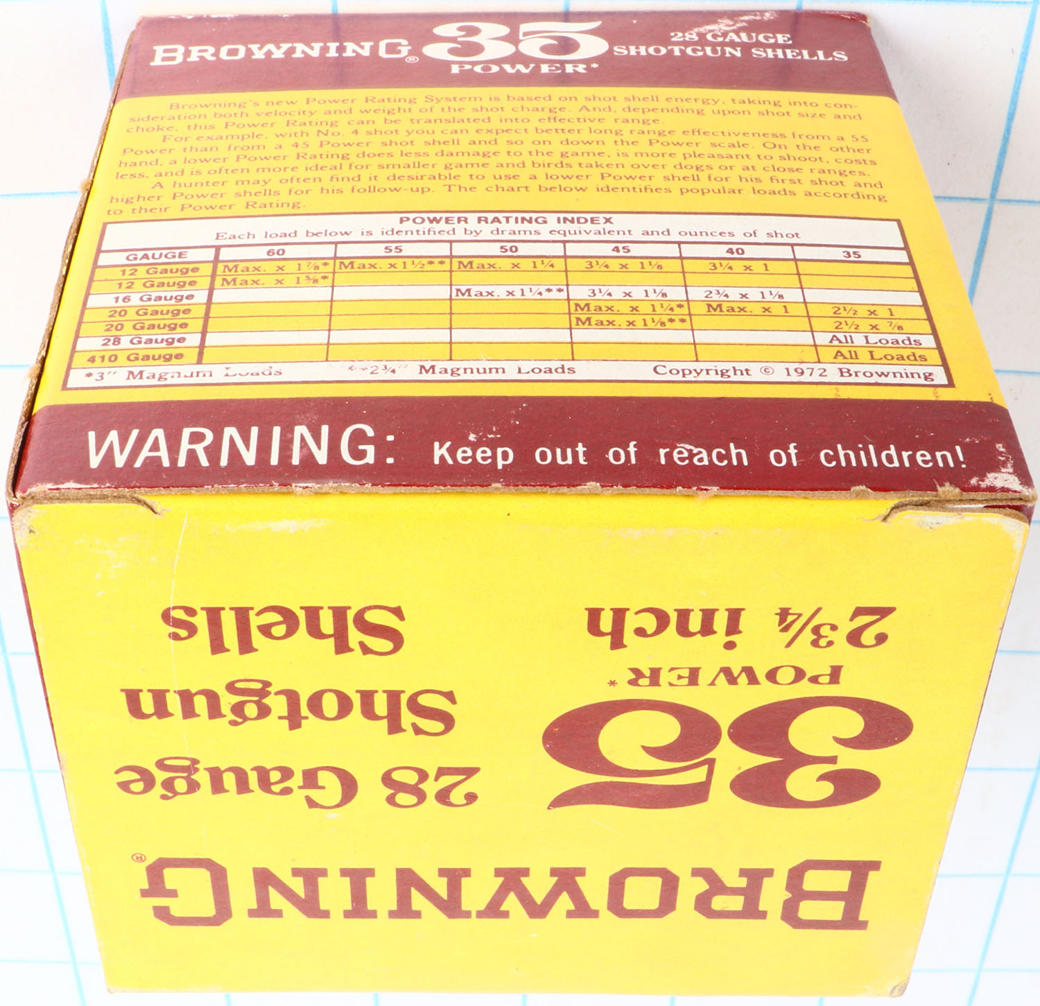 Browning, 35 Power, 28ga., 1pc., Full, shot size 7 1/2, 2 3/4'', maroon, yellow & white box, box is solid with great color, shells are excellent. Grade: Excellent - Value: 10 to 40