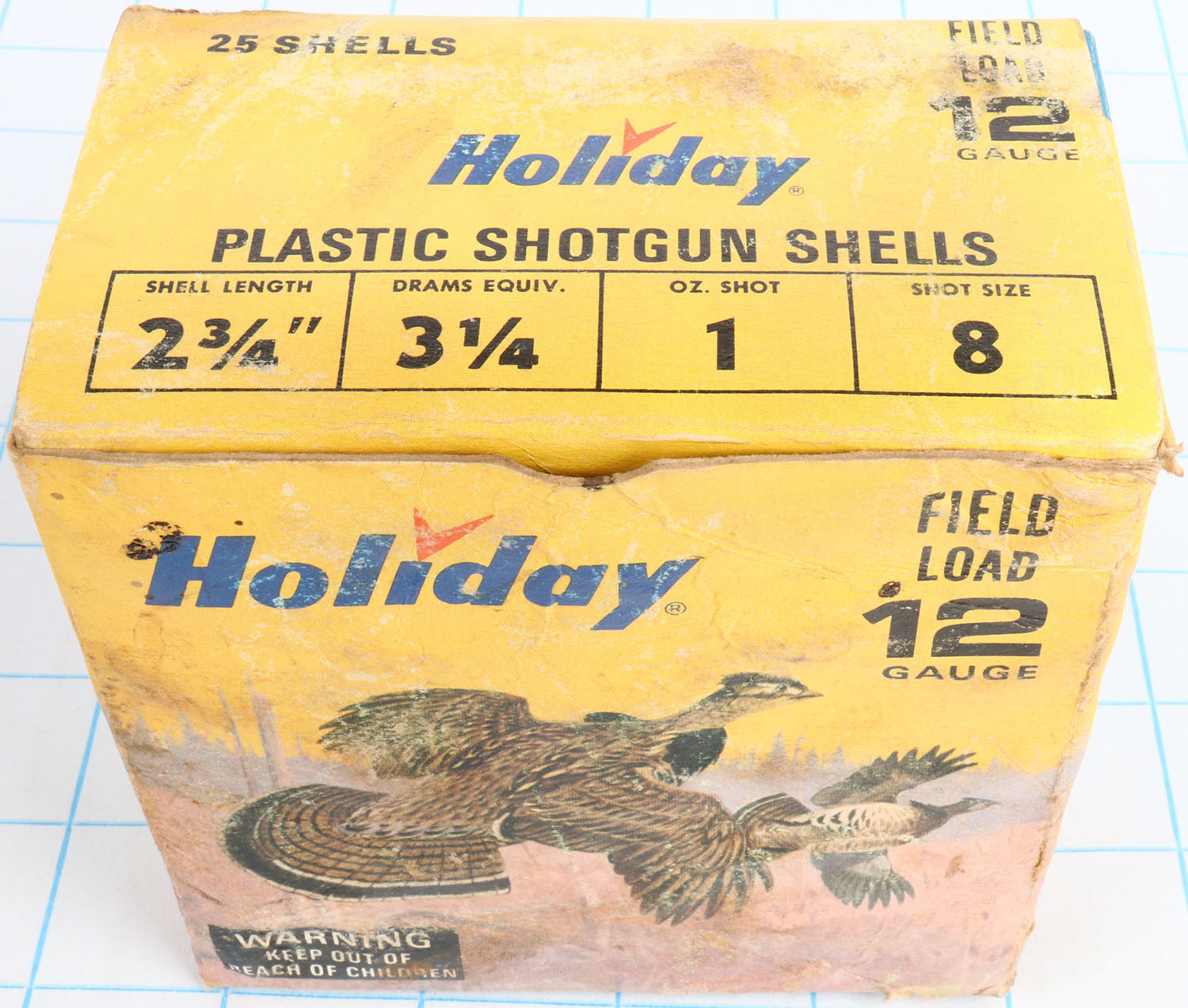 Holiday, Grouse/Rabbit Scene, 12ga., 1pc., Empty, 2 3/4'', shot size 8, multi color graphics of Grouse/Rabbit by Les Kouba, box has scuffing, light edge wear & light soiling with very nice colors. Grade: Very Good ++ - Value: 10 to 40