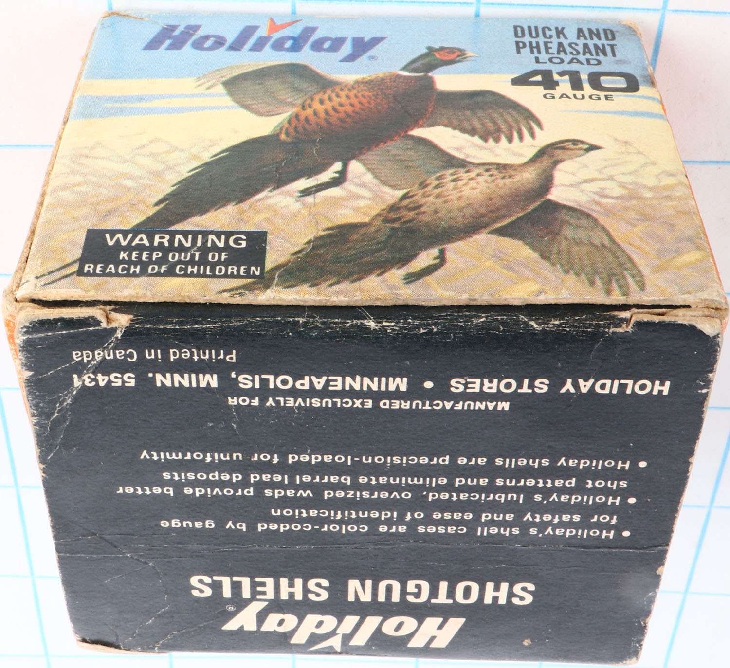 Holiday, Mallards/Pheasants, 410 GAUGE, 1pc., Partial 23rds., 3'', shot size 6, multi color graphics by Les Kouba, box is solid with great colors, light soiling & light scuffing, Shells are excellent. Grade: Excellent - Value: 40 to 180
