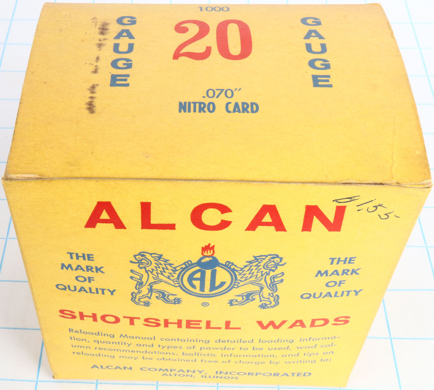Alcan Shotshell Wads, 20ga., 1pc., Full, box is solid, Wads are excellent. Grade: Excellent - Value: 20 to 100
