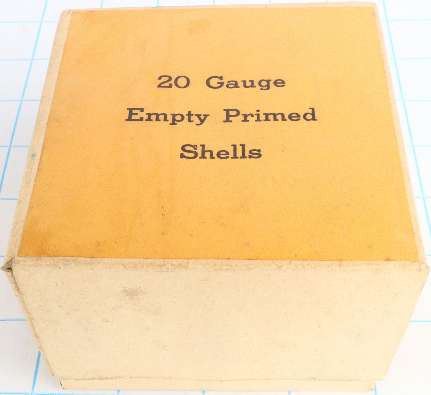 Unknown Manufacture, 20ga., 2pc., Full of Empty Primed Paper Shells, all are Federal Monark, box is solid, Shells are excellent. Grade: Excellent - Value: 10 to 30