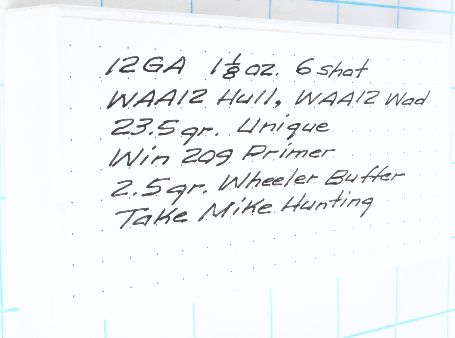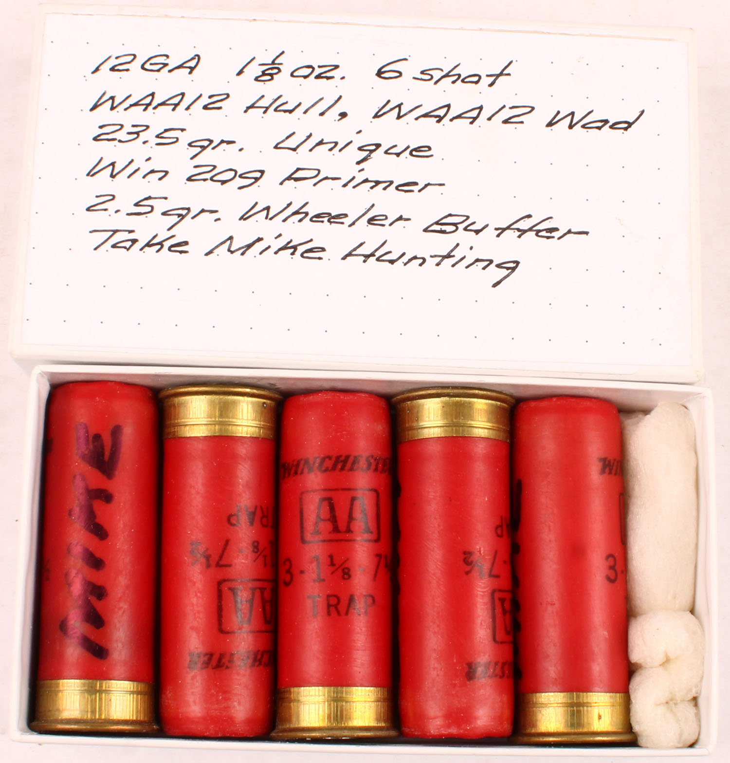 White Box with sticker on top, 12ga., 2pc., Full of Winchester AA, shot size 7 1/2, box is solid, Shells are excellent with Mike written on them. Grade: Excellent + - Value: 2 to 20