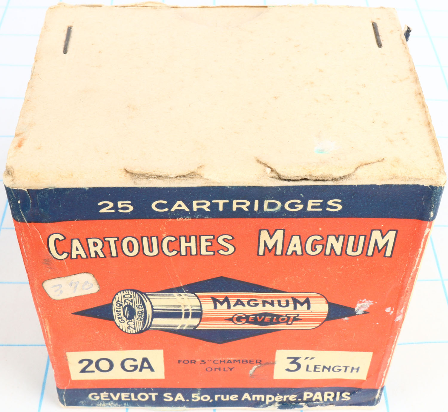 Gevelot Magnum, 20ga., 2pc., Partial 8rds with missing and mixed primers, shot size 4, multi-colored box, box has seam split & light edge wear with very nice colors, Shells are excellent. Grade: Very Good ++ - Value: 10 to 40