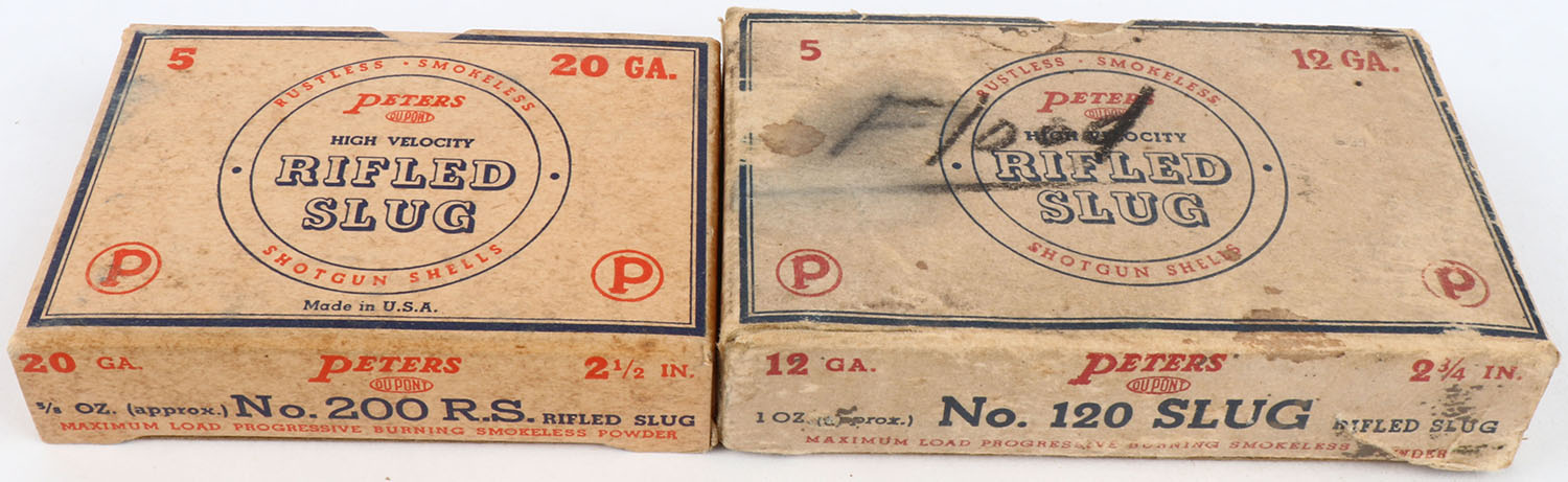 Lot of 2 Peters, 12ga./20ga., 1pc., Full, shot size Rifled Slugs, multi-colored box. Grade: Excellent - Value: 10 to 30