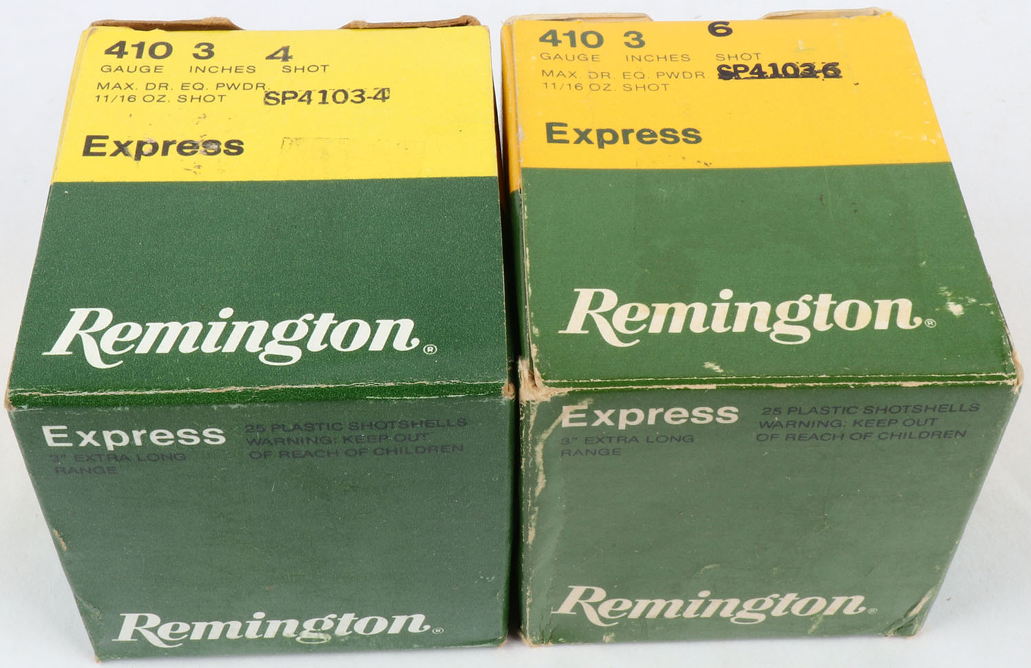 Lot of 2 Remington, 410ga., 1pc., Appears Full, shot size 6 & 4, multi-colored box. Grade: Excellent - Value: 10 to 30