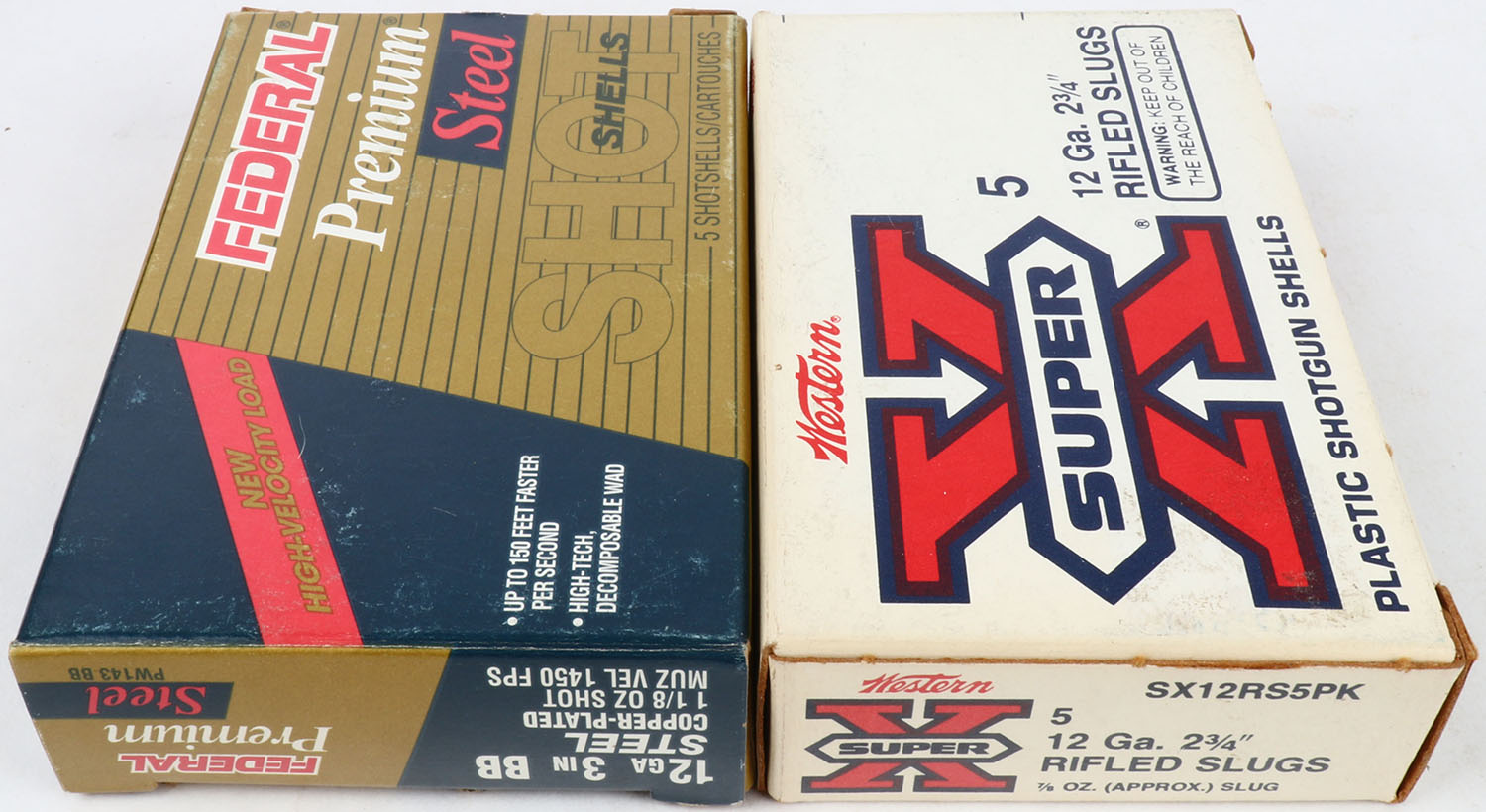 Lot of 2 Western/Federal, 12ga., 1pc., Appears Full, shot size Rifled Slug & BB, multi-colored box. Grade: Excellent - Value: 10 to 30
