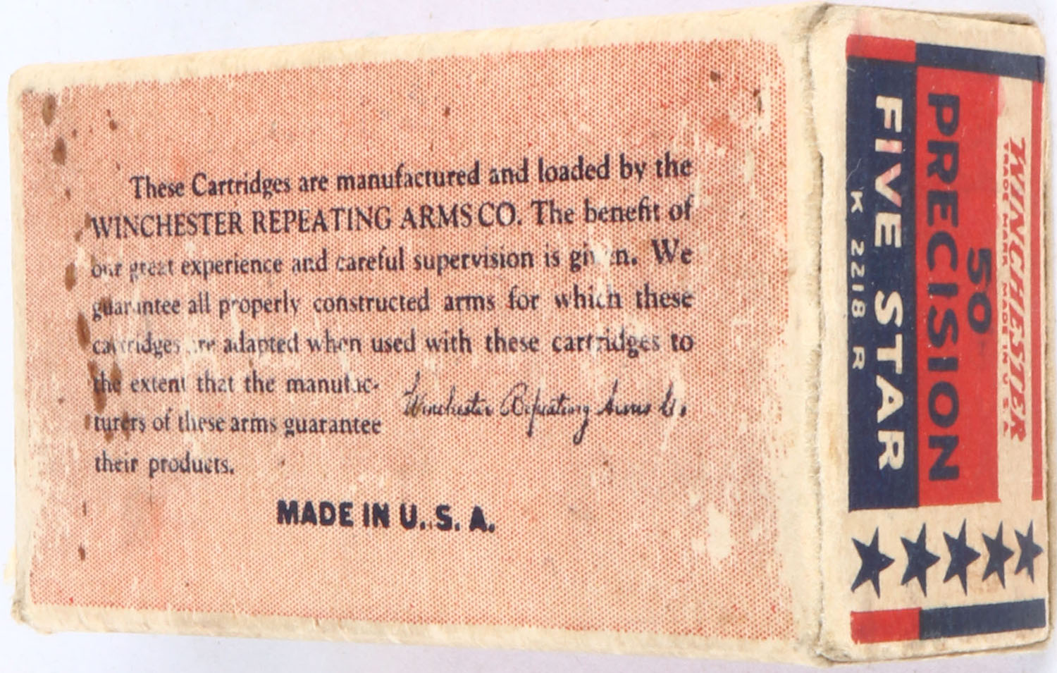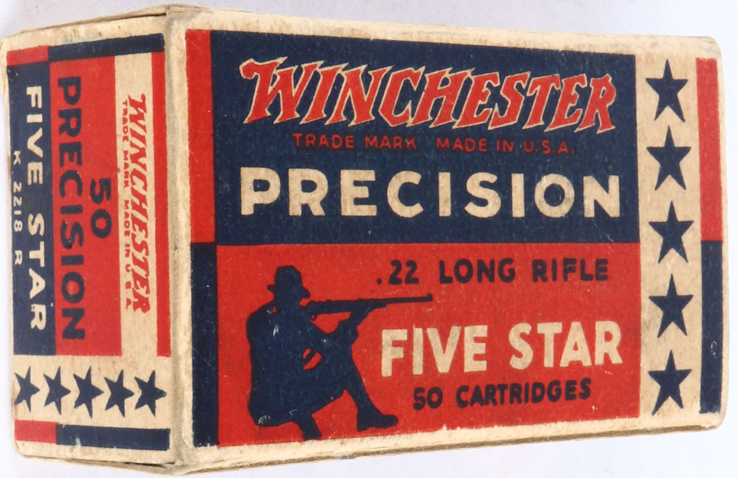 Winchester, Precision Five Star, .22 Long Rifle, RHWeb: WRA-53 LR-7b, Full, 2pc. Red blue & white box, box is solid with excellent color, some age soiling, right end flap is torn, very minor edge & corner wear, left end flap is solid, inside tray is solid, ammo is excellent. Grade: Very Good ++ - Value: 50 to 200