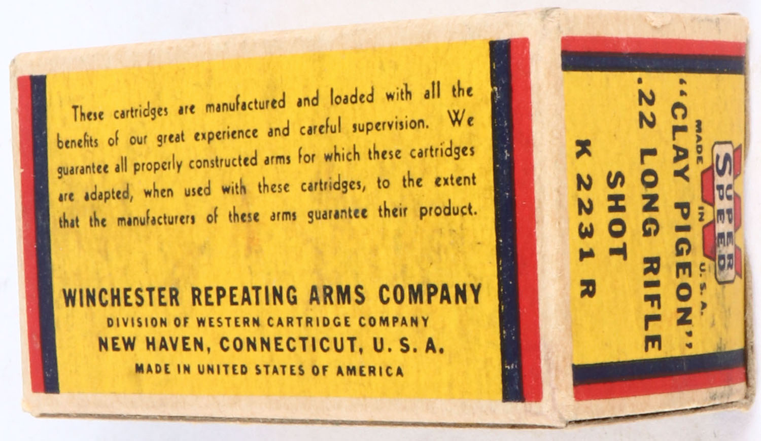 Winchester, Super Speed, ''Clay Pigeon'', .22 Long Rifle Shot, RHWeb: WRA-15 LR-5b, Full, 1pc. Yellow blue & red box, box is solid with excellent color, minor age soiling, very minor corner wear, edges are crisp, end flaps are solid, ammo is excellent to minty. Grade: Excellent + - Value: 30 to 90