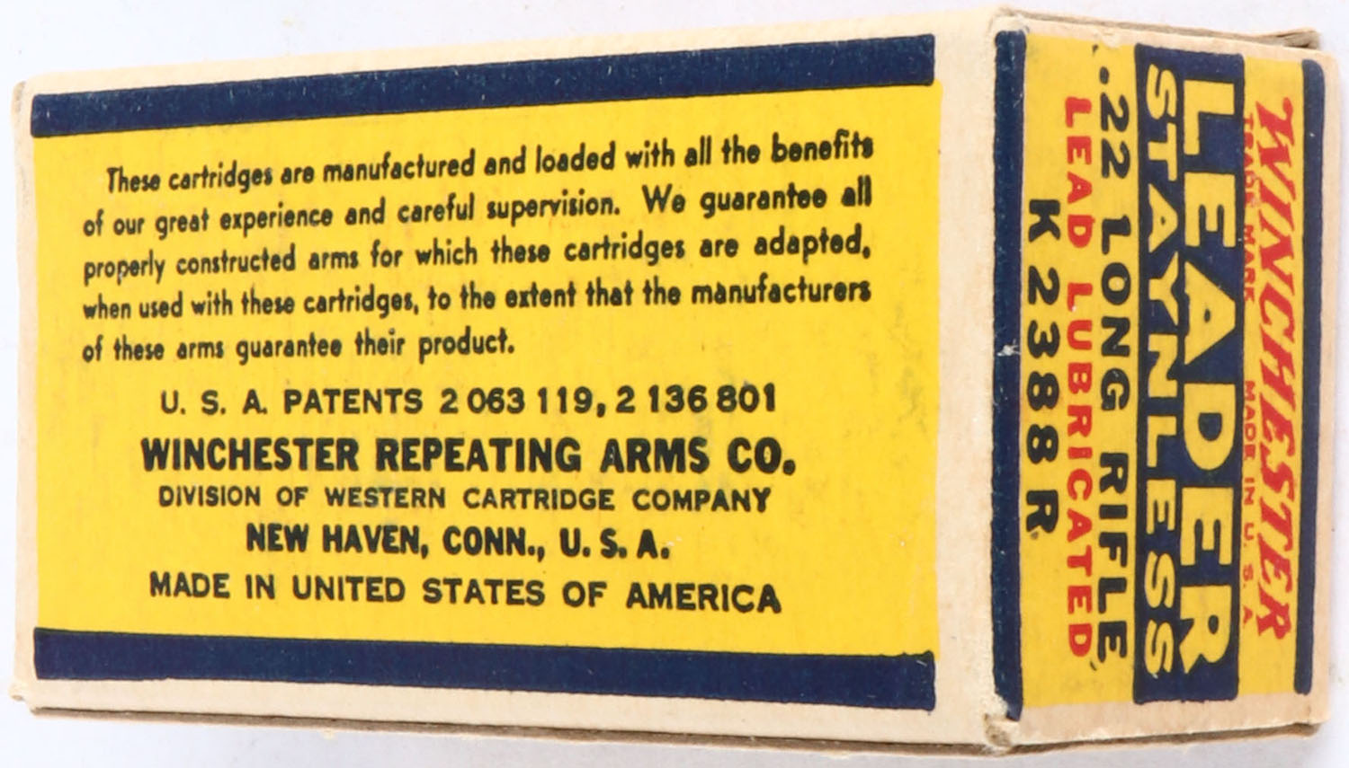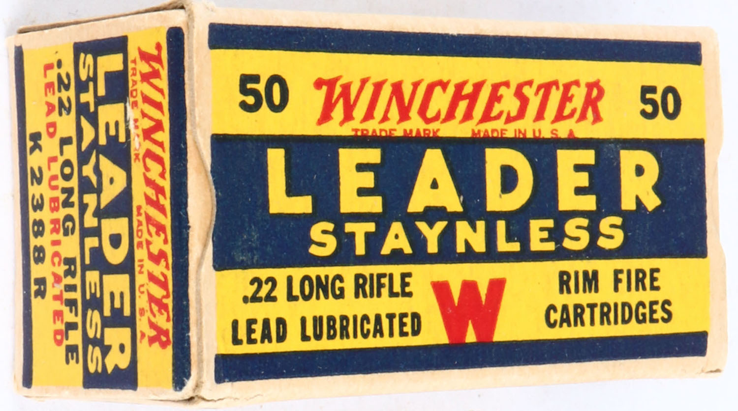 Winchester, Leader Staynless, .22 Long Rifle, RHWeb: WRA-55 LR-1c, Full, 1pc. Yellow blue & red box, box is solid with excellent color, very minor age soiling, minor corner wear, edges are mostly crisp, end flaps are solid, ammo is very good to excellent. Grade: Excellent + - Value: 20 to 60