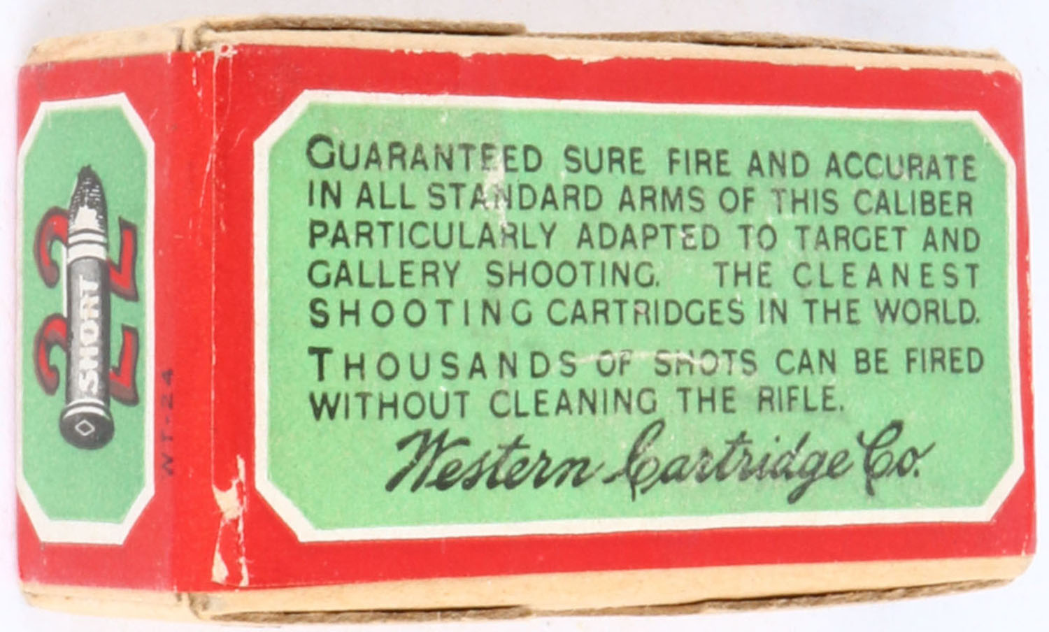 Western, Rim Fire Cartridges, .22 Short, Lesmok Powder, RHWeb: WCC-3 S-2b, FULL & SEALED, 2pc. Buff box with green & red wraparound label, box is near mint with minty color, only has very minor shelf wear on bottom, corners are mostly sharp, edges are crisp, label is intact. Grade: Excellent ++ - Value: 50 to 200