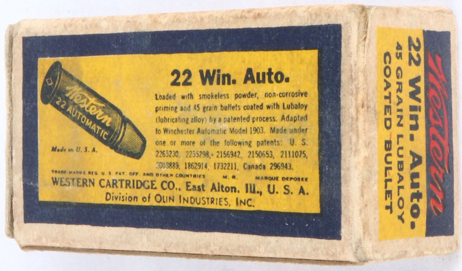 Western, .22 Win. Auto., 45 Grain Lubaloy Coated Bullet, RHWeb: WCC-5 WA-2a, Full, 1pc. Yellow blue & red bullseye box, left end flap is torn, box has very good color, some age soiling & color fading, some edge & corner wear, right end flap is solid, ammo is very good. Grade: Very Good + - Value: 4 to 40