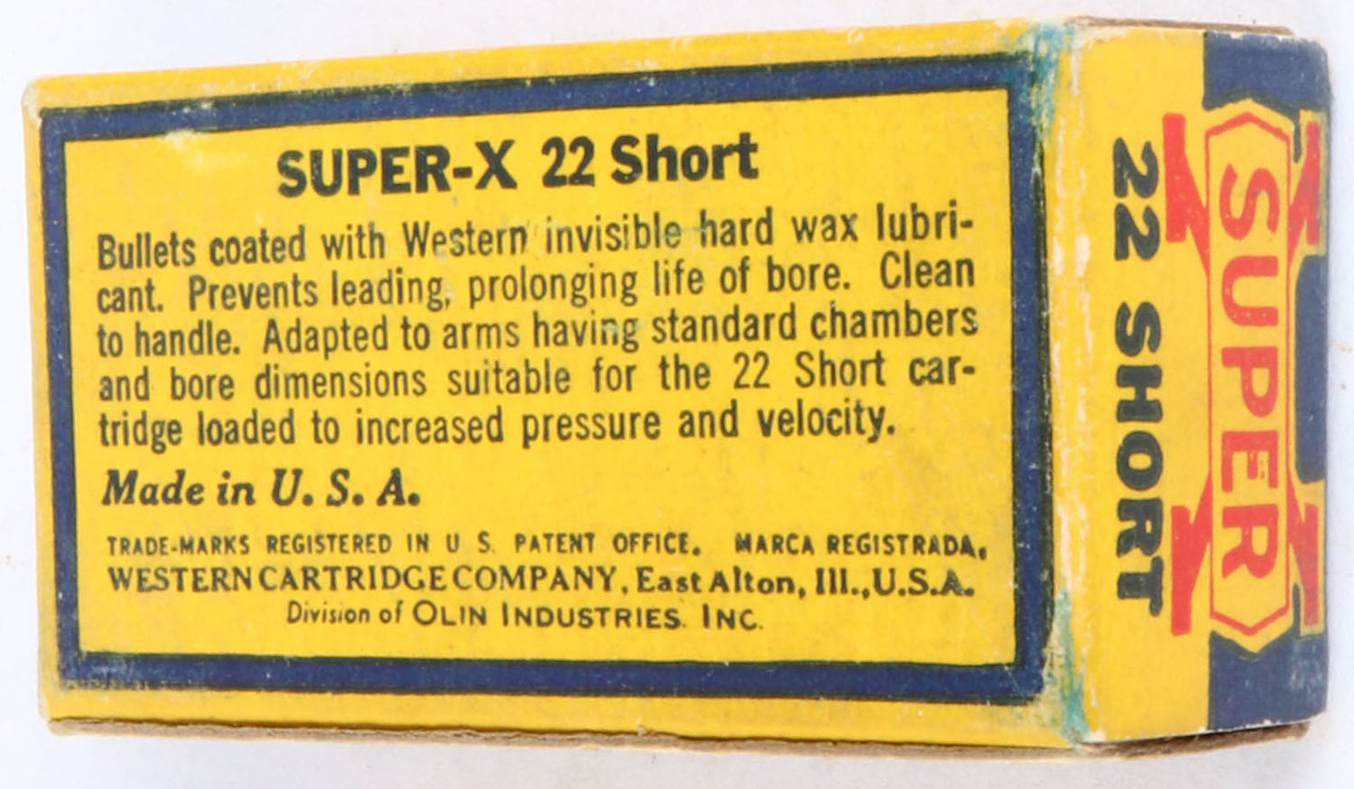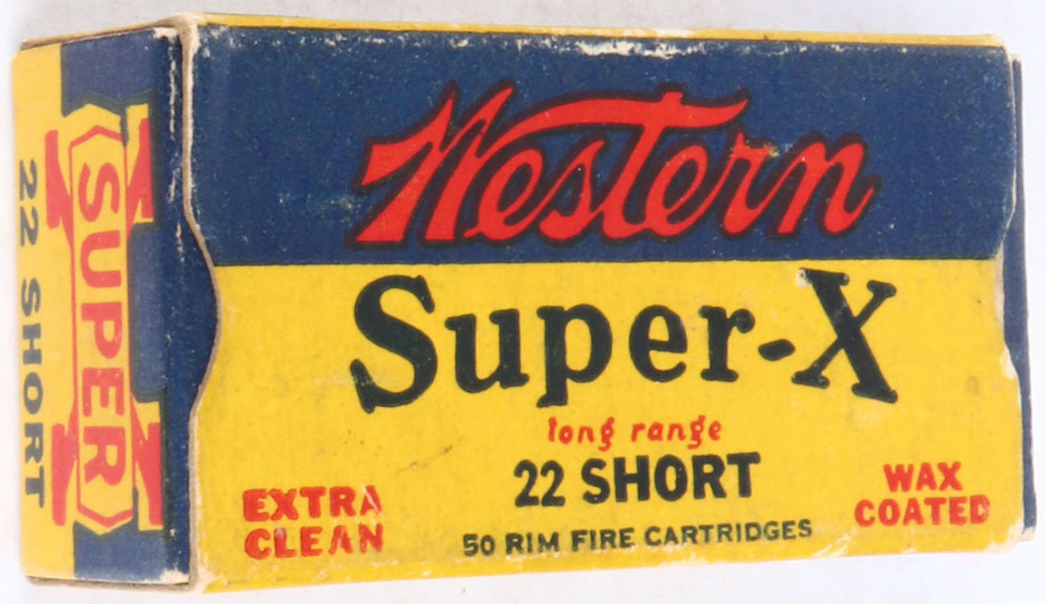 Western, Super-X, .22 Short, Extra Clean Wax Coated, RHWeb: WCC-Super-X Shorts-14 S-27, Full, 1pc. Yellow blue & red box, box is solid with excellent color, very minor age soiling, very minor edge & corner wear, end flaps are solid, ammo is excellent. Grade: Excellent - Value: 10 to 50