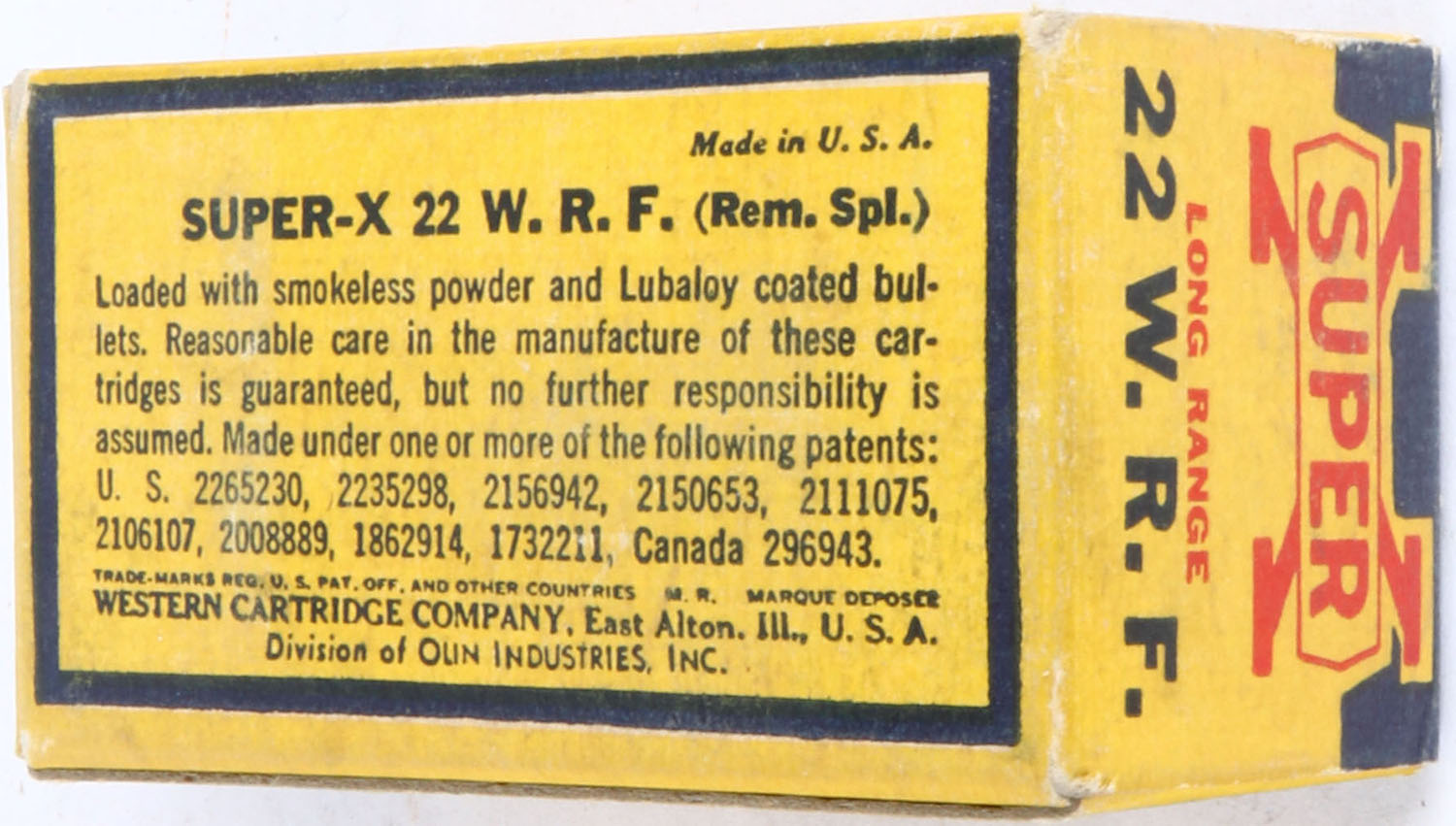 Western, Super-X, .22 W.R.F. (Rem. Spl.), RHWeb: WCC-Super-X W.R.F.-8 WRF-13, Full, 1pc. Yellow blue & red box, box is solid with very good to excellent color, minor age soiling & shelf wear, very minor corner wear, edges are mostly crisp, end flaps are solid, ammo is excellent. Grade: Excellent - Value: 8 to 40