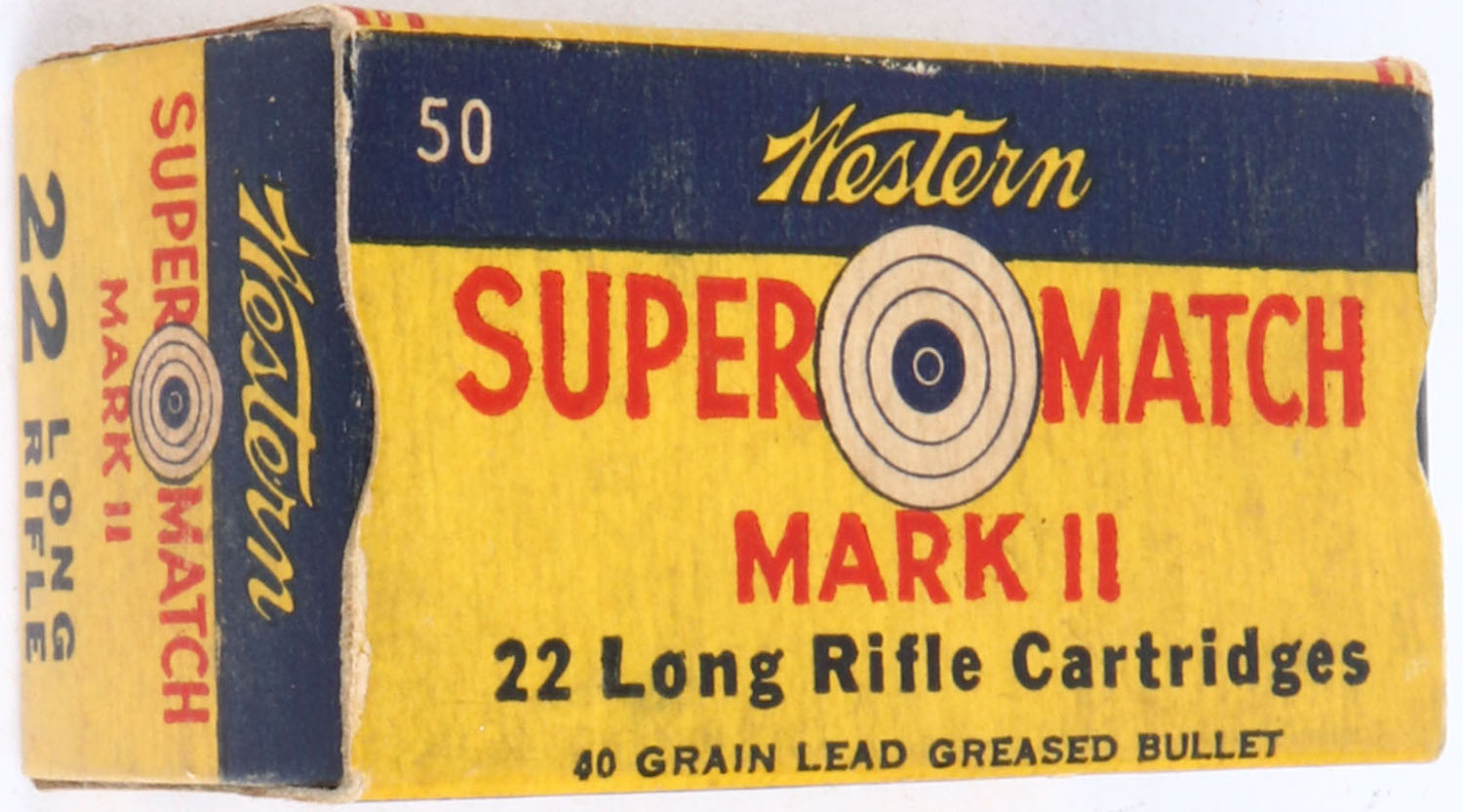 Western, Super Match Mark II, .22 Long Rifle, RHWeb: WCC-51.2 LR-3e, Full, 1pc. Yellow blue & red box, box is solid with very good to excellent color, minor age soiling, very minor corner wear, edges are mostly crisp, end flaps are solid, ammo is excellent to minty. Grade: Excellent + - Value: 10 to 50