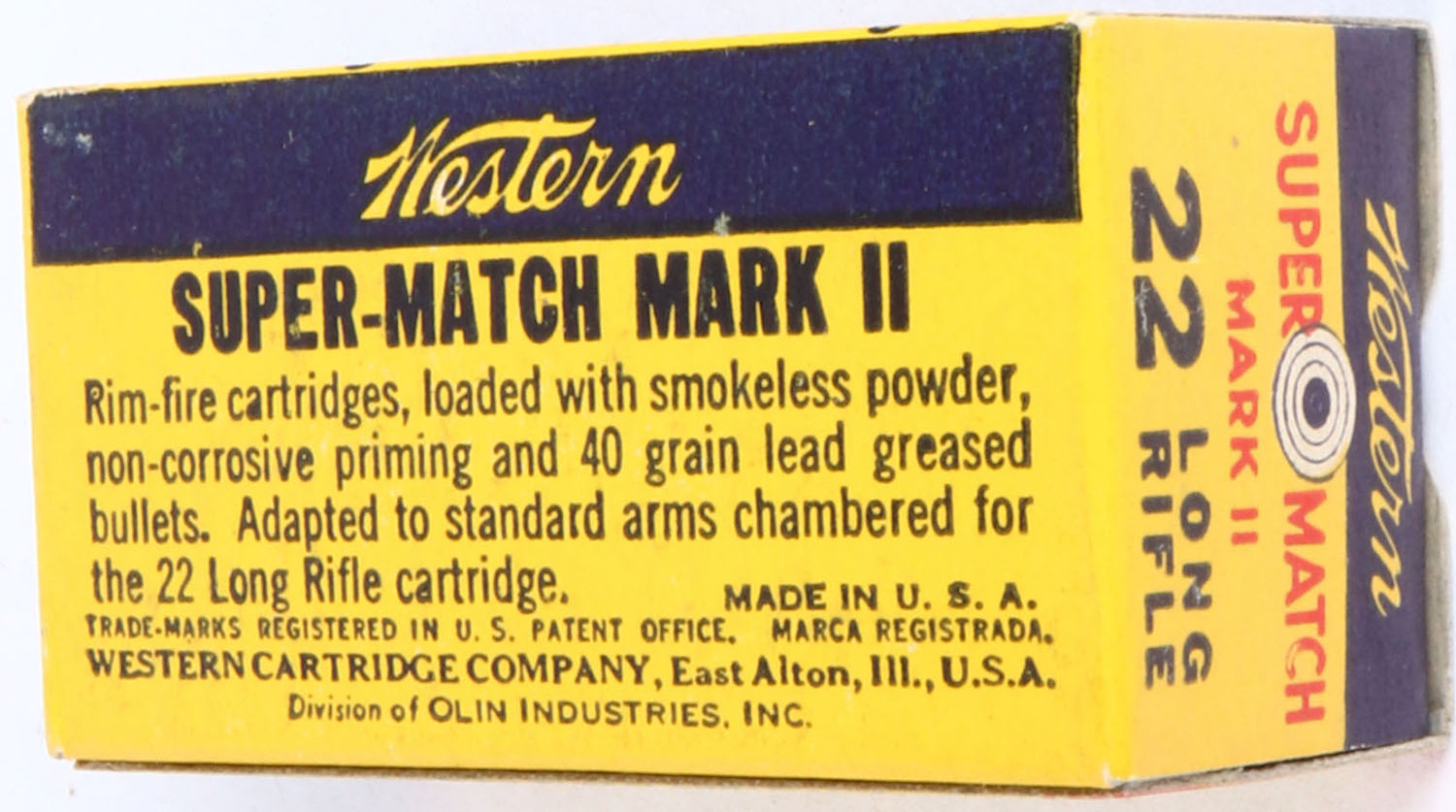 Western, Super Match Mark II, .22 Long Rifle, RHWeb: WCC-51.2 LR-3g, Full, 1pc. Yellow blue & red box, box is MINT with minty color, corners are sharp, edges are crisp, end flaps are solid, ammo is excellent to minty. Grade: MINT - Value: 20 to 60