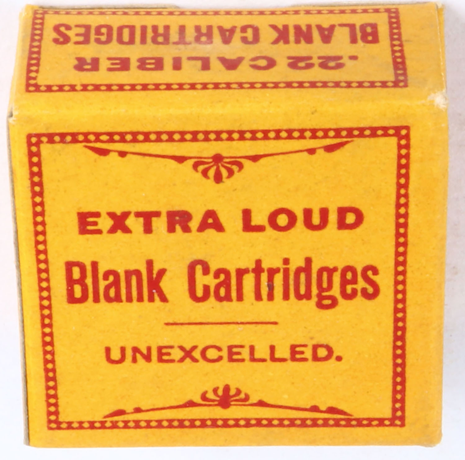 Peters, Extra Loud Blank Cartridges, .22 cal., RHWeb: PCC-2 SB-2, Full, 1pc. Yellow & red box, box is near mint with excellent to minty color, only very minor corner wear, edges are crisp, flaps are solid, ammo is excellent. Grade: Excellent ++ - Value: 4 to 20
