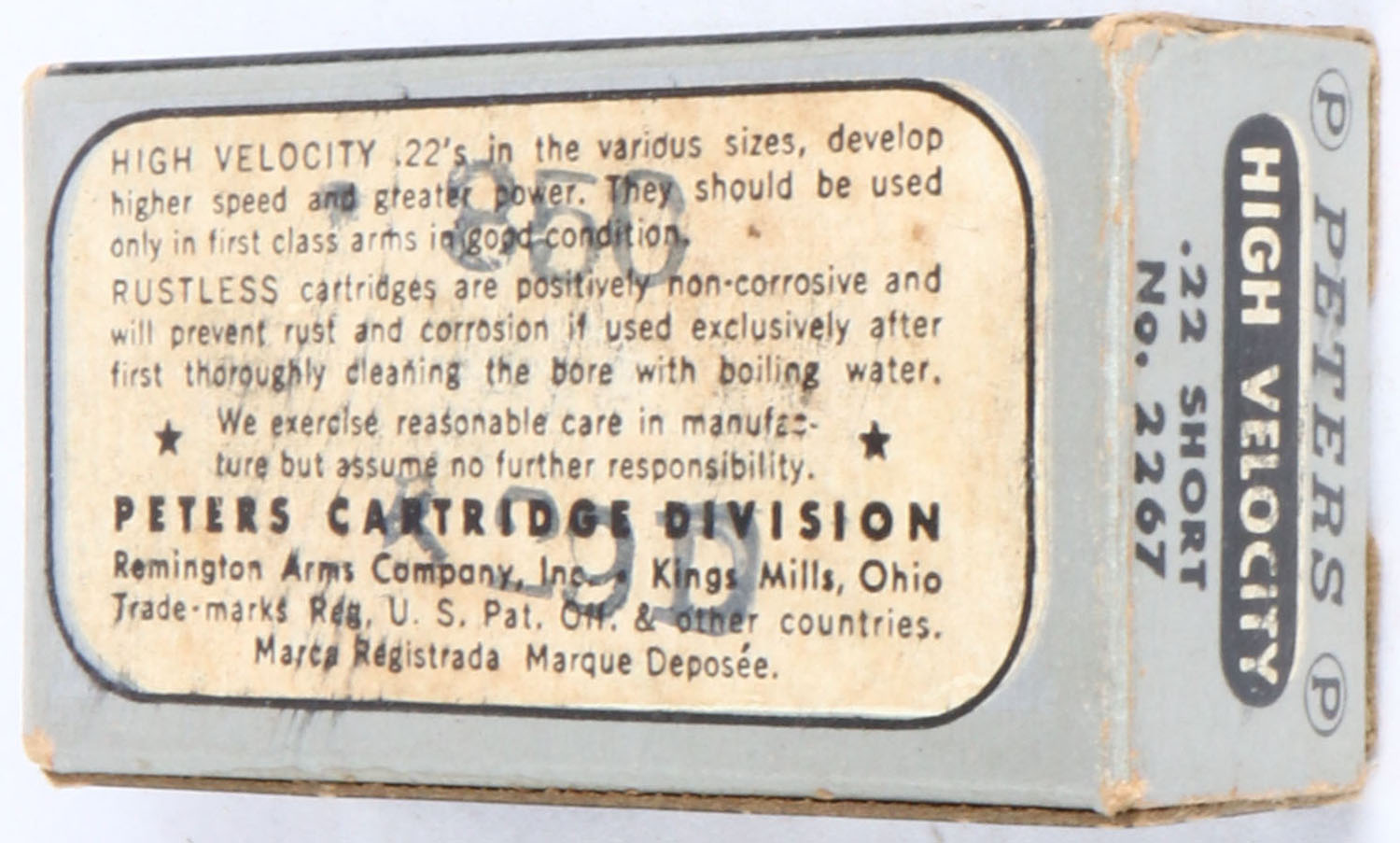 Peters, High Velocity Rustless, .22 Short, RHWeb: PCC-14 S-1aa, Full, 1pc. Silver black & white box, box is solid with excellent color, minor edge & corner wear, end flaps are solid, ammo is excellent. Grade: Excellent + - Value: 10 to 40