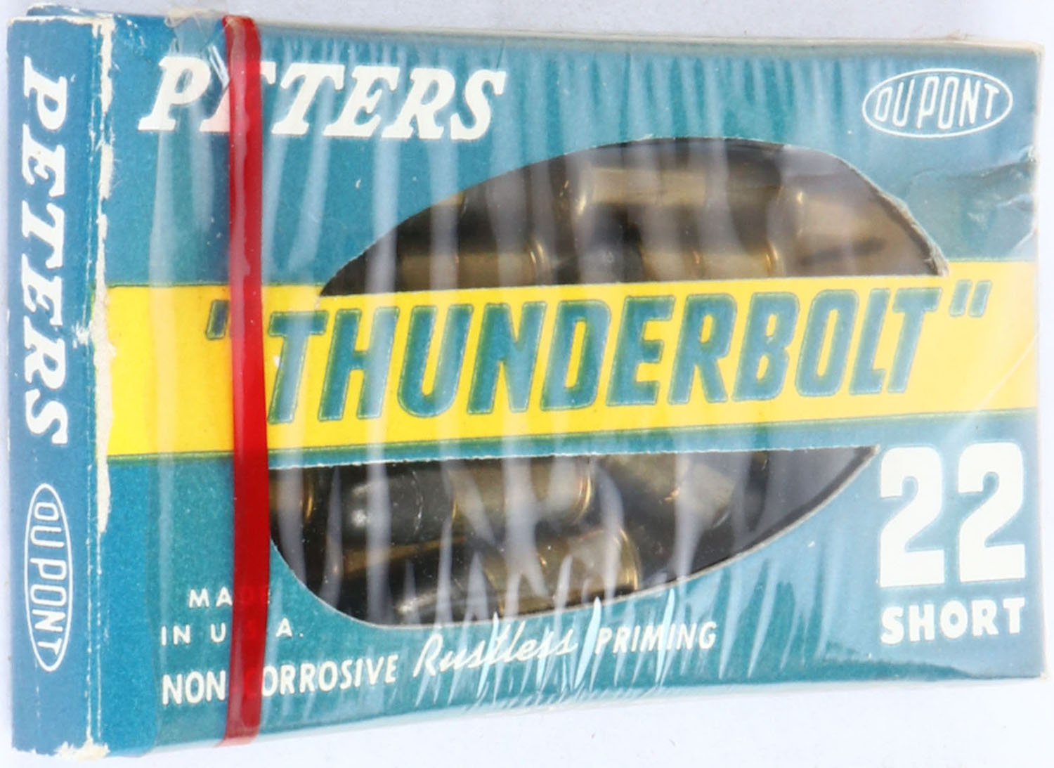 Peters, ''Thunderbolt'', .22 Short, RHWeb: PCC-17 S-5, Full, 1pc. Blue yellow & white box, box is solid with very good color, some color fading & edge wear, corners are mostly sharp, box is warped, ammo is minty. Grade: Very Good ++ - Value: 20 to 60