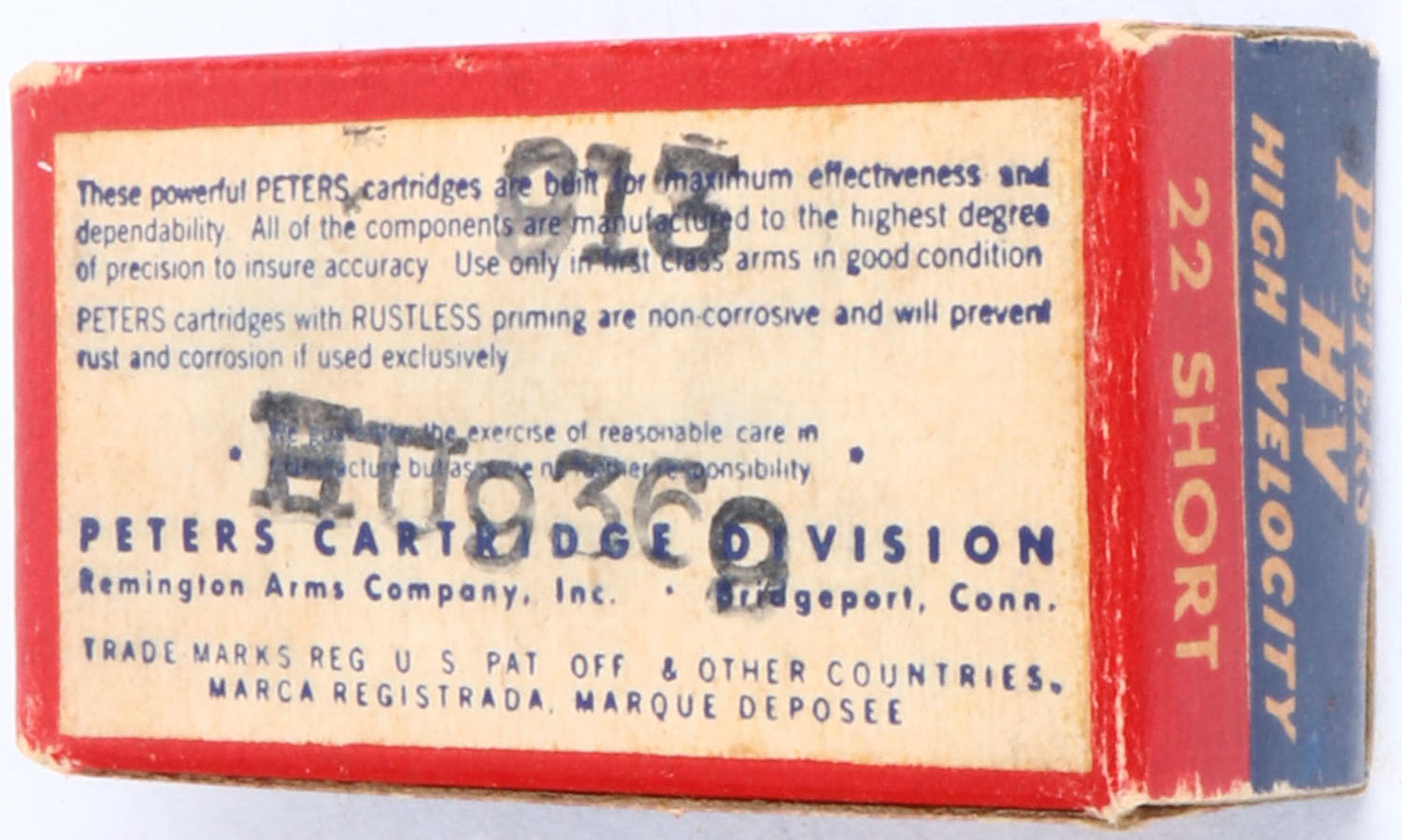 Peters, High Velocity, .22 Short, RHWeb: PCC-17 S-1a, Full, 1pc. Blue red & white box, box is solid with very good color, some age soiling, minor edge & corner wear, end flaps are solid, ammo is excellent. Grade: Excellent - Value: 8 to 40
