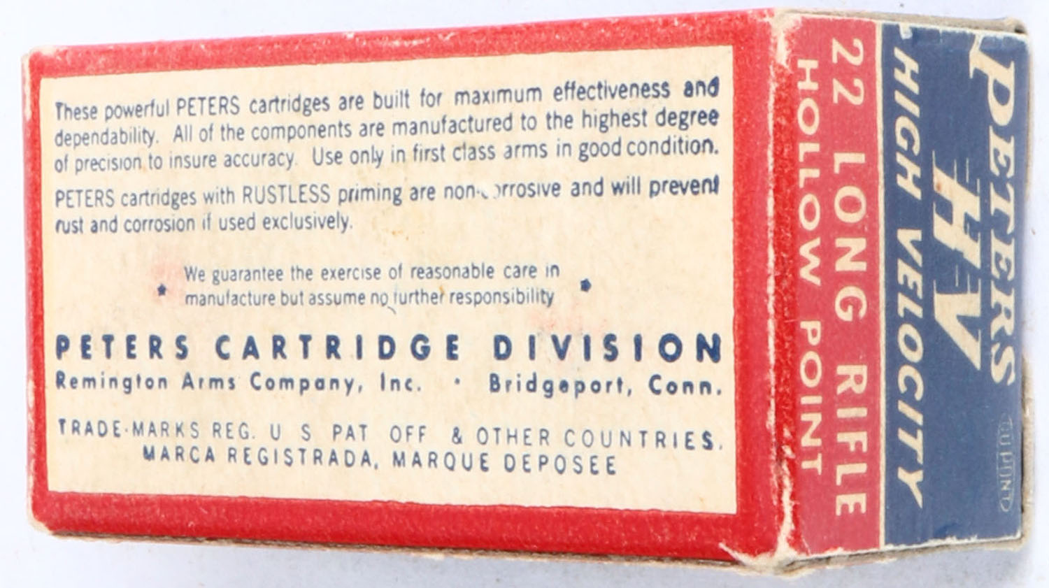 Peters, High Velocity, .22 Long Rifle Hollow Point, RHWeb: PCC-17 LR-3c, Full, 1pc. Blue red & white box, box is solid with excellent color, very minor edge & corner wear, end flaps are solid, ammo is excellent. Grade: Excellent - Value: 8 to 40