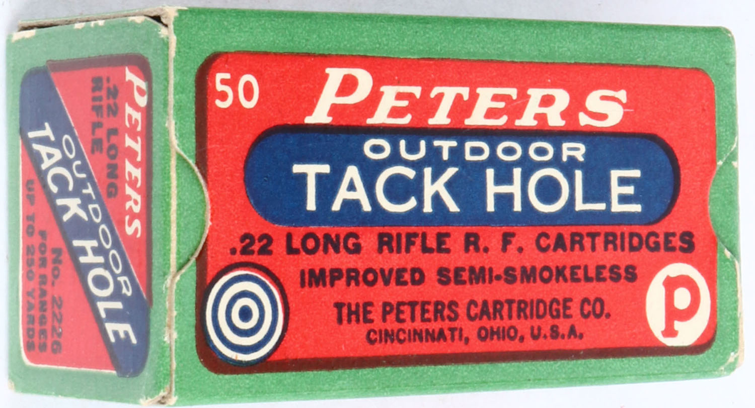 Peters, Outdoor Tack Hole, .22 Long Rifle, Improved Semi-Smokeless, RHWeb: PCC-52 LR-10, Full, 1pc. Red green & blue box, box is solid with excellent to minty color, minor edge & corner wear, end flaps are solid, ammo is excellent. Grade: Excellent + - Value: 50 to 100