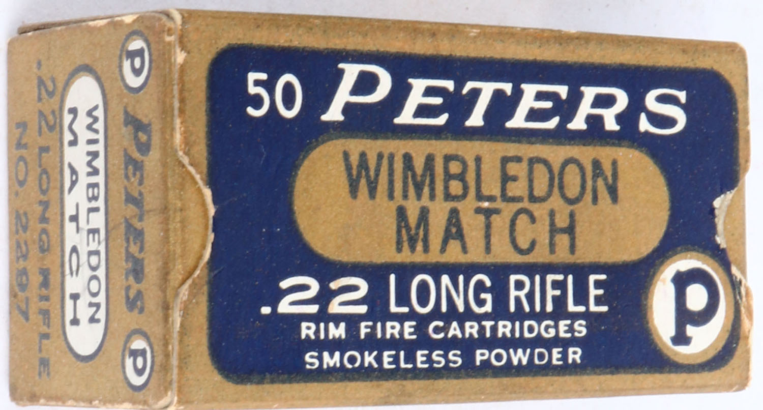 Peters, Wimbledon Match, .22 Long Rifle, RHWeb: PCC-53-A LR-1, Full, 1pc. Blue & gold box with Filmkote insert, box is solid with excellent color, very minor corner wear, edges are mostly crisp, end flaps are solid, sticker on bottom, ammo is excellent to minty. Grade: Excellent + - Value: 50 to 200
