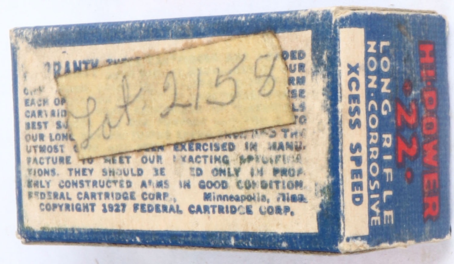 Federal, Hi-Power, .22 Long Rifle, RHWeb: FED-5 LR-1a, Partial 49rds., 1pc. Blue white & red box, box is solid with very good color, some age soiling, shelf wear, minor edge & corner wear, end flaps are solid, tape on bottom, ammo is excellent. Grade: Very Good - Value: 4 to 20