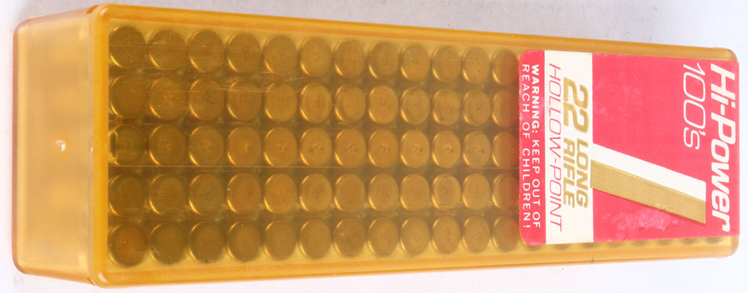 Federal, Hi-Power 100's, .22 Long Rifle Hollow Point, RHWeb: FED-11 LR-2b, FULL & SEALED, 2pc. Amber plastic tray with red white & gold sealing label, box is solid, label is intact with very good to excellent color, very minor color fading, ammo appears mint. Grade: Excellent + - Value: 8 to 40
