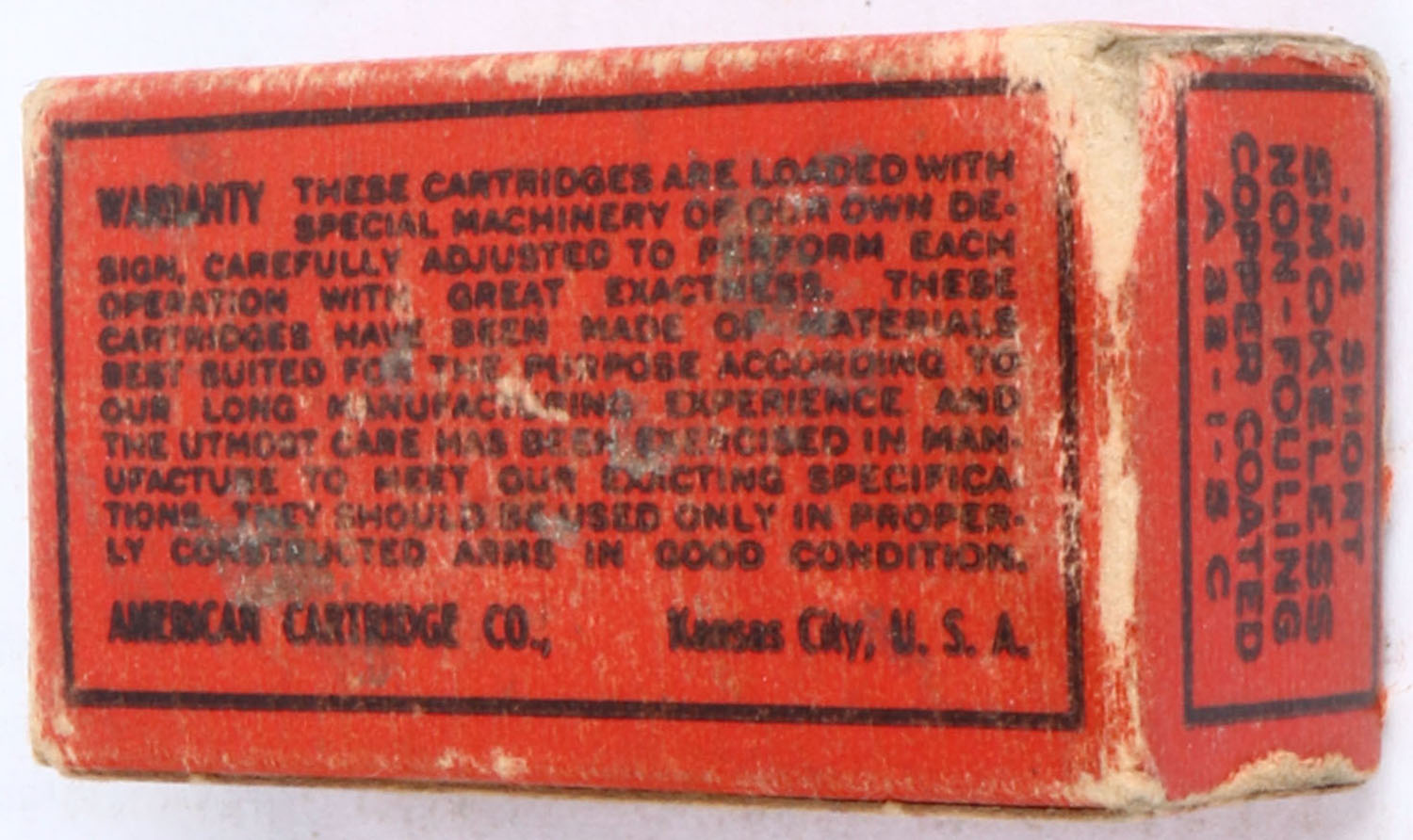 American, American Eagle, .22 Short, Copper Coated, Non-Fouling, RHWeb: ACC-1 S-2b, Partial 48rds., 1pc. Red black & white box, box is solid with very good color, some age soiling, color fading, minor edge & corner wear, end flaps are solid, ammo is very good. Grade: Very Good ++ - Value: 50 to 150