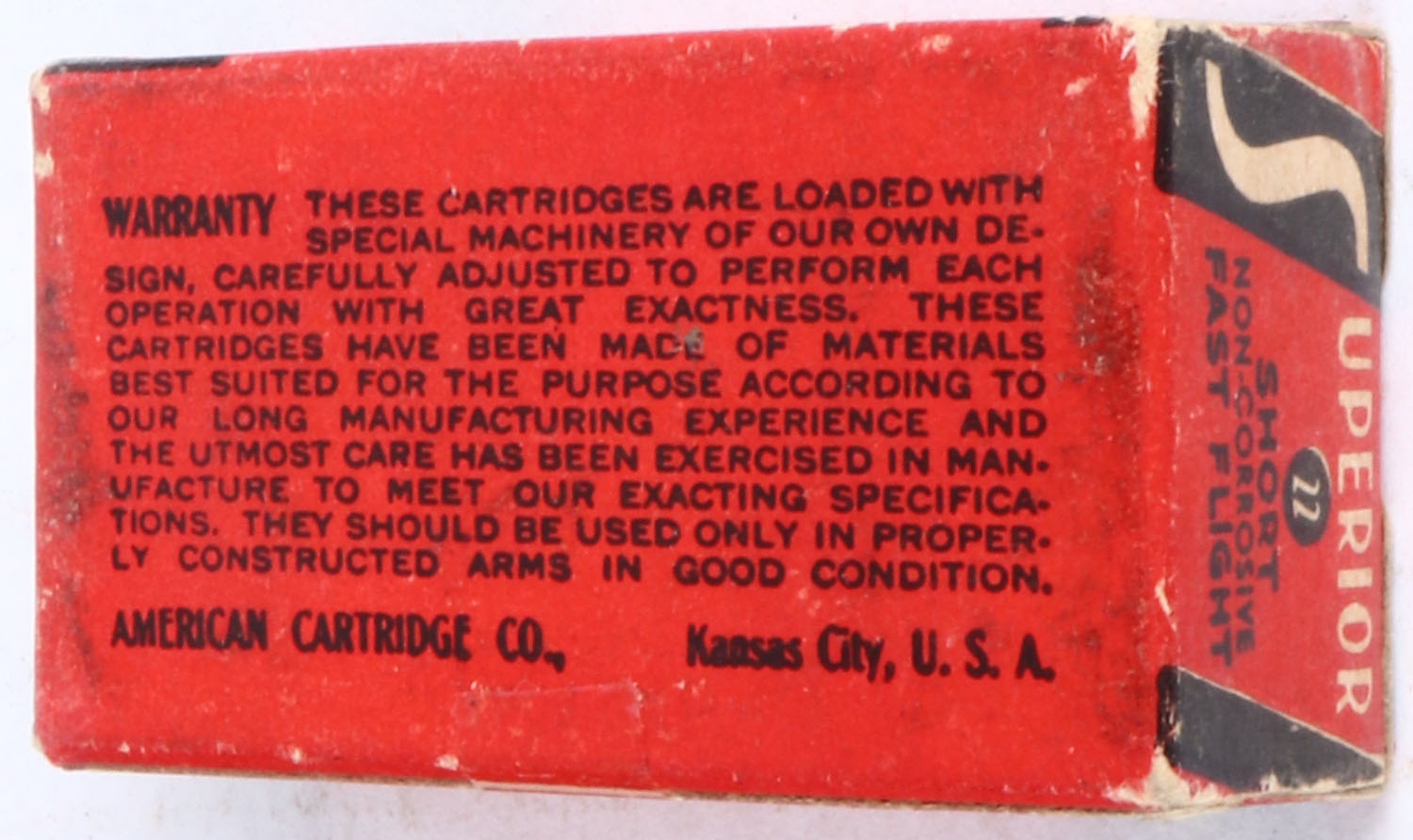 American, Superior Cartridges, .22 Short, RHWeb: ACC-2 S-1a, Full, 1pc. Red white & black box, box is solid with very good to excellent color, some age soiling & shelf wear, minor corner wear, edges are mostly crisp, end flaps are solid, ammo is very good. Grade: Excellent - Value: 10 to 40
