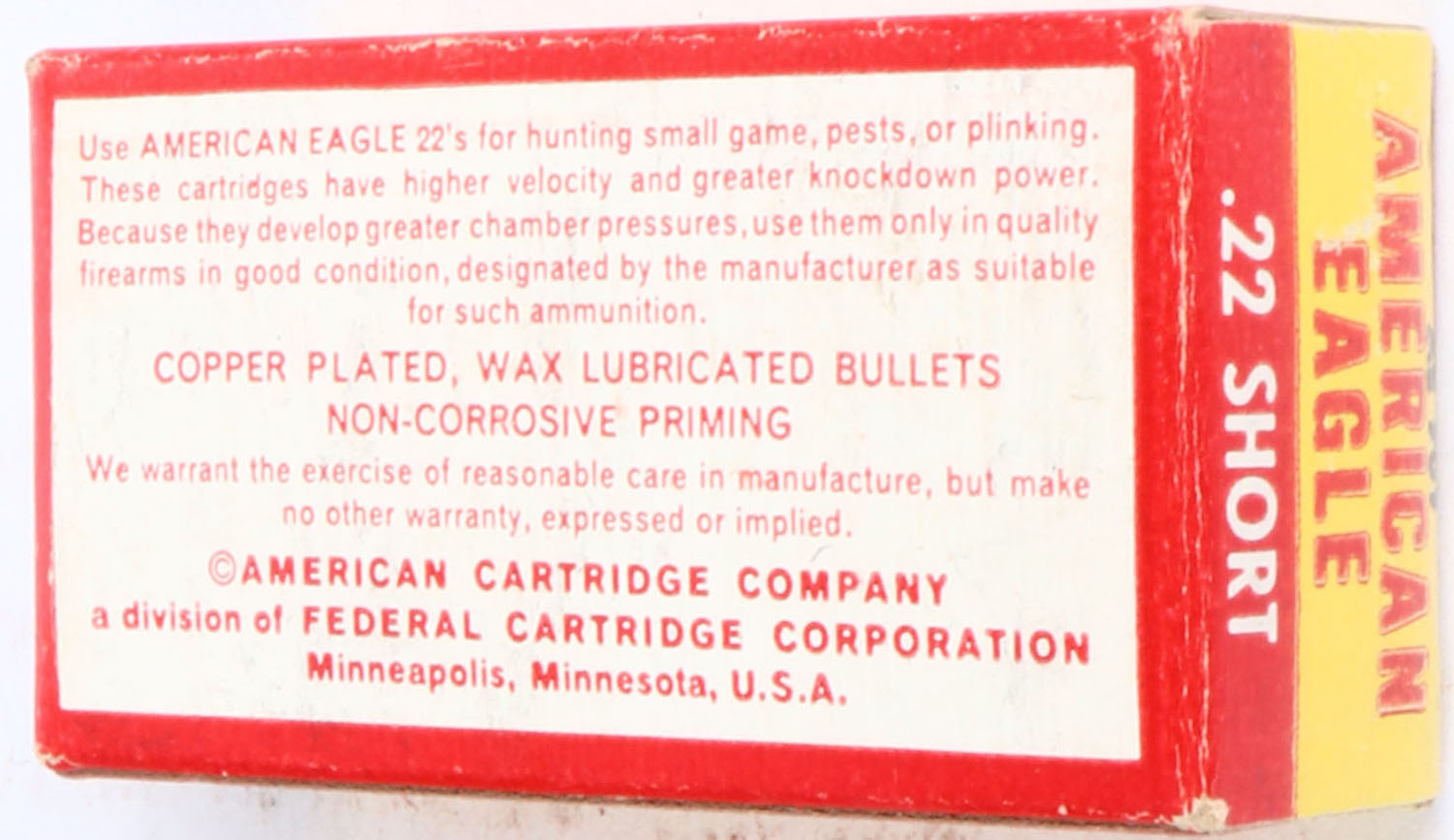 American, American Eagle, .22 Short, RHWeb: ACC-5 S-1, Full, 1pc. Yellow & red box, box is near mint with minty color, only very minor shelf wear, corners are mostly sharp, edges are crisp, end flaps are solid, ammo is excellent. Grade: Excellent ++ - Value: 10 to 50