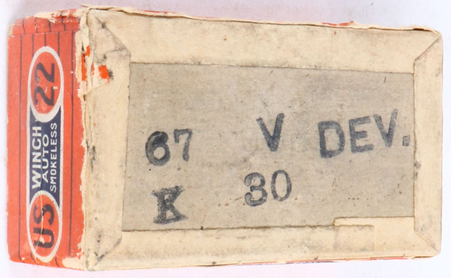 U.S., Smokeless Rim Fire, .22 Winchester Auto, RHWeb: US-7 WA-1a (printer code on top only), FULL & SEALED, 2pc. Buff box with orange/blue top & side sealing labels, box is solid with excellent color, shelf wear, corners are sharp, edges are crisp, labels are intact. Grade: Excellent - Value: 40 to 120