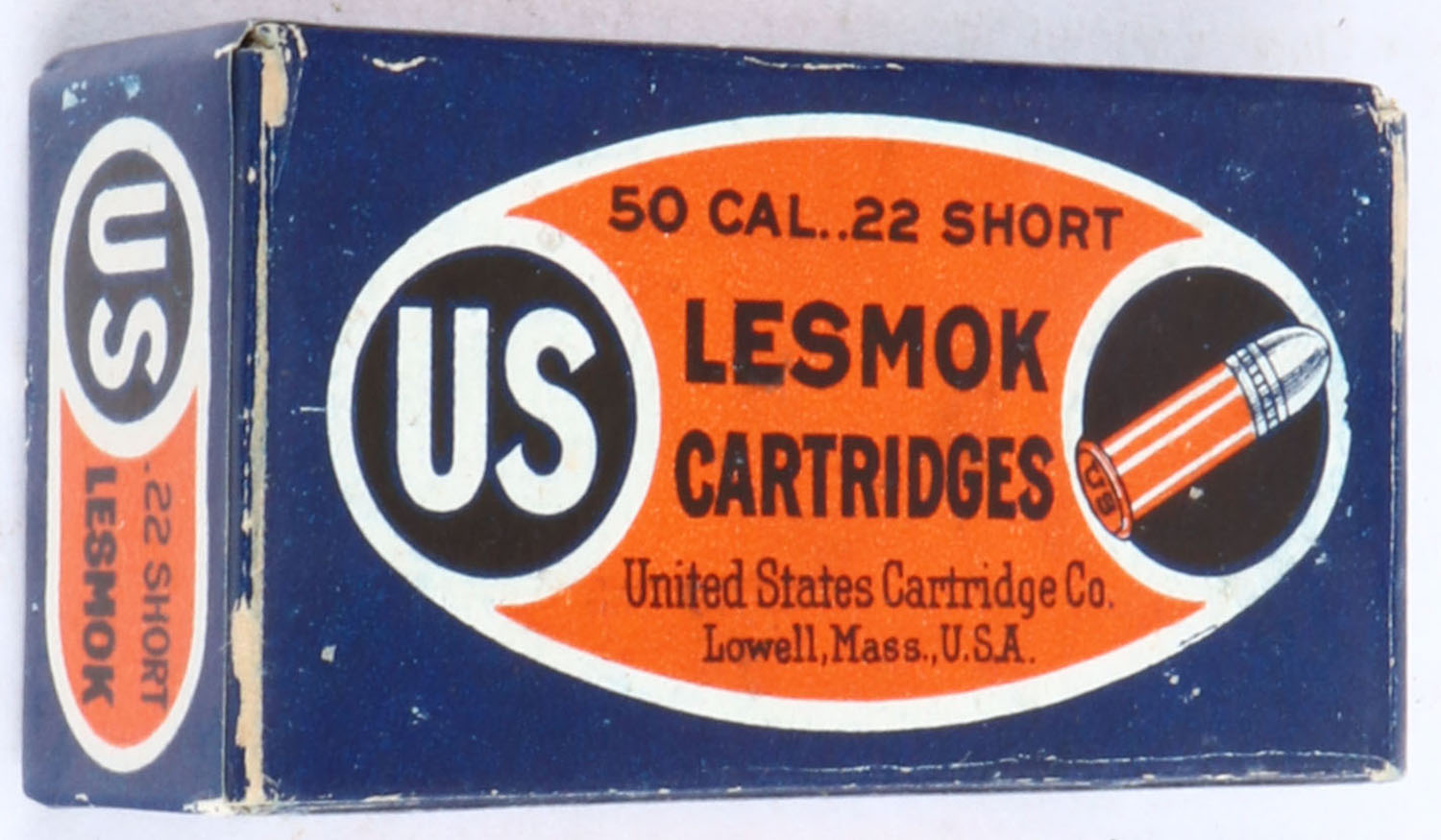 U.S., Lesmok Cartridges, .22 Short, RHWeb: US-50 S-12, FULL & SEALED, 1pc. Blue orange & white box, box is solid with excellent color, very minor edge & corner wear, side sealing label is intact. Grade: Excellent + - Value: 6 to 30