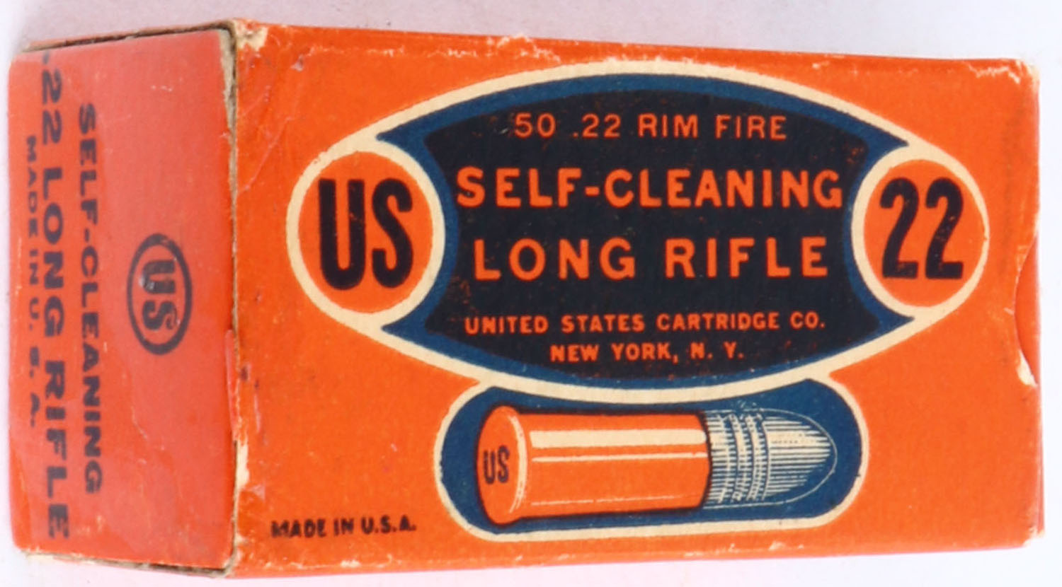U.S., Self-Cleaning, .22 Long Rifle, RHWeb: US-10A LR-1c, Full, 1pc. Orange & black box, box is solid with excellent color, minor edge & corner wear, end flaps are solid, ammo is very good to excellent. Grade: Excellent + - Value: 20 to 60
