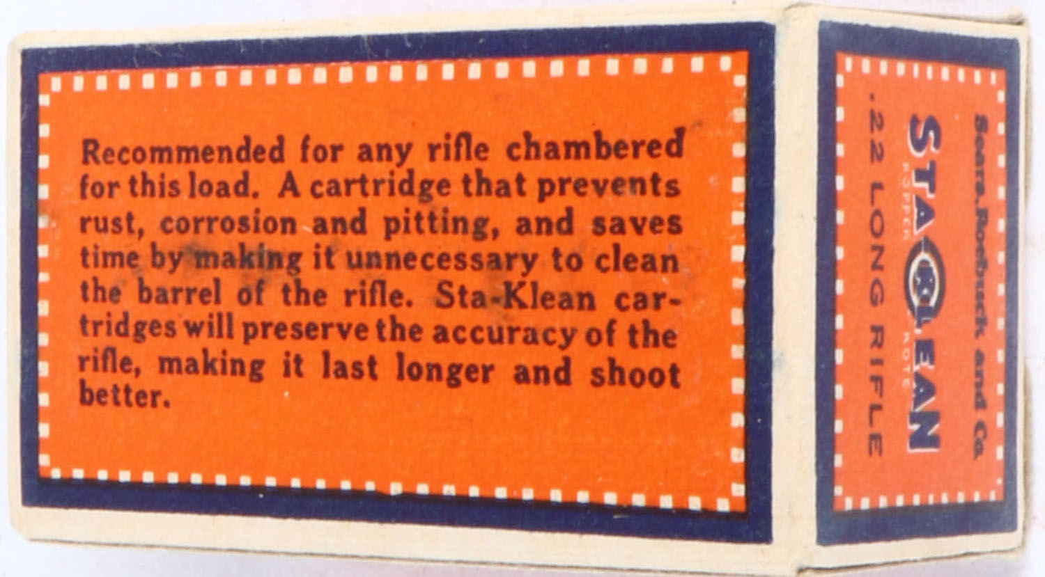 Sears, Sta-Klean, .22 Long Rifle, Kopper Kote, RHWeb: SEARS-3 LR-1a, Full, 1pc. Orange blue & buff box, box is near mint with minty color, only very minor corner wear, edges are crisp, end flaps are solid, ammo is excellent. Grade: Excellent ++ - Value: 20 to 60