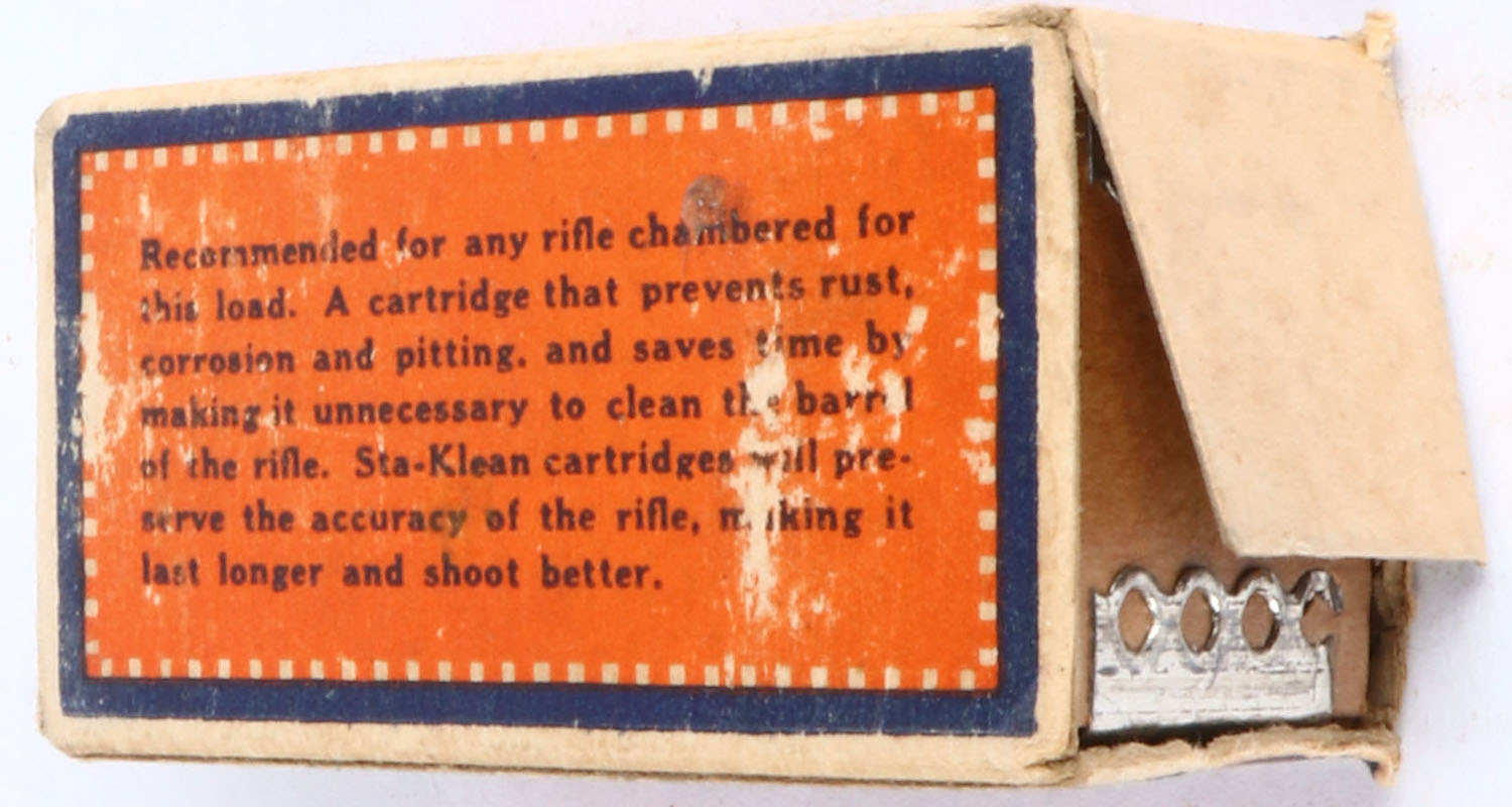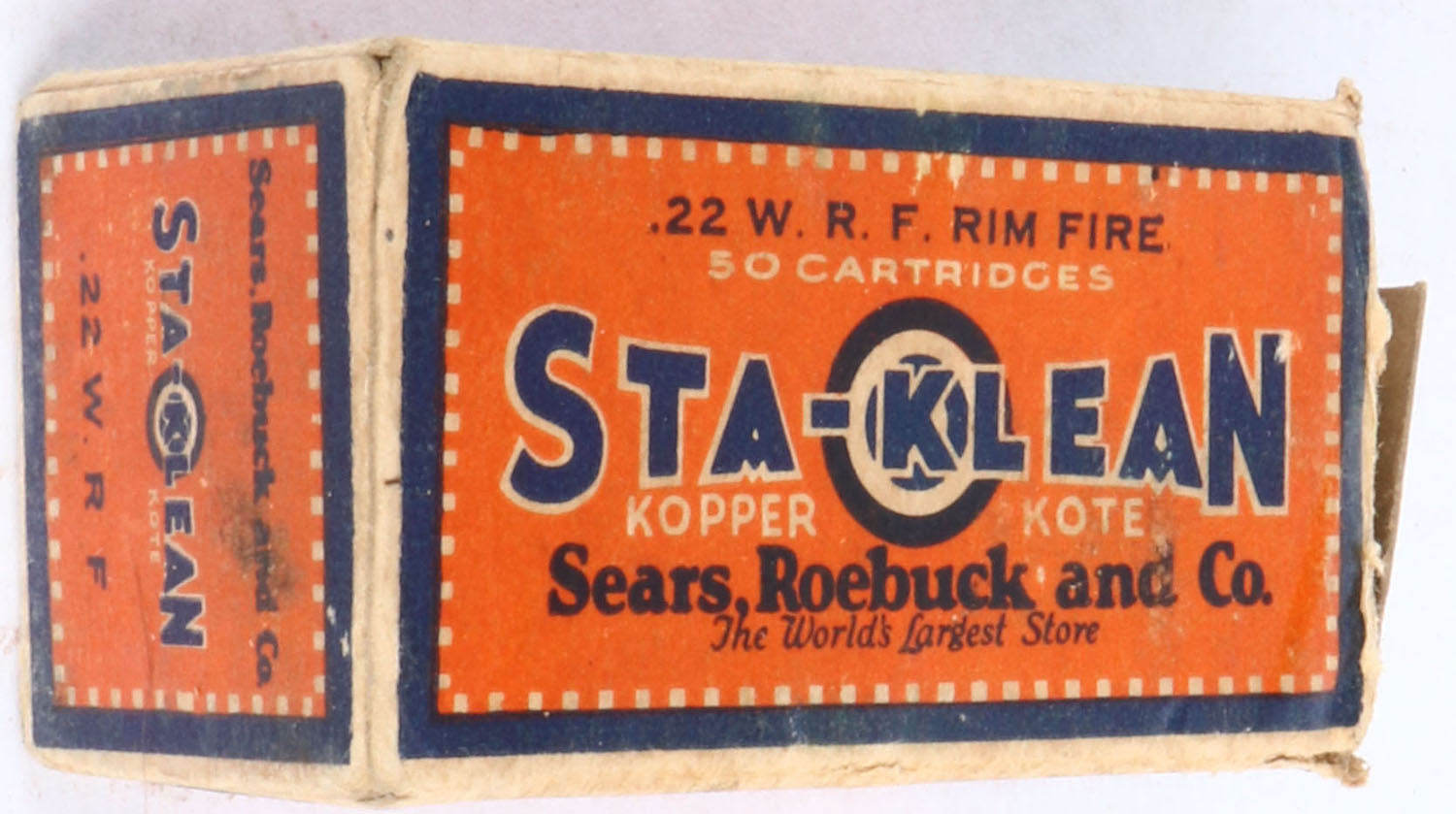Sears, Sta-Klean, .22 W.R.F., Kopper Kote, RHWeb: SEARS-3 WRF-1b, Full, 1pc. Orange blue & buff box, box is missing right end flap, very good to excellent color, some age soiling, corner wear, minor edge wear, left end flap is solid, ammo is excellent. Grade: Very Good + - Value: 8 to 40