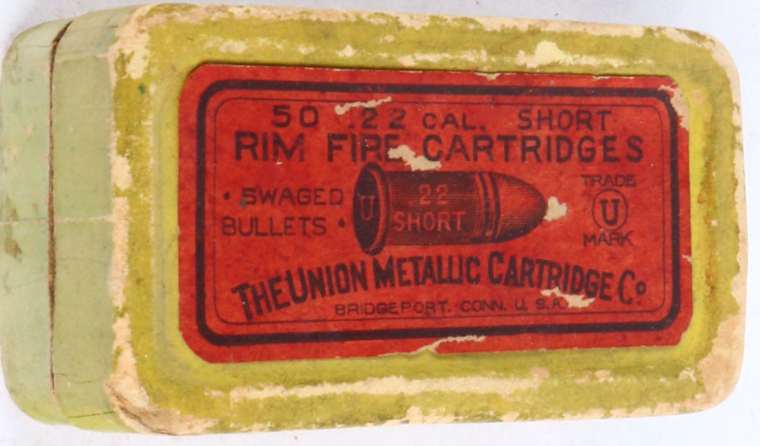 UMC, Rim Fire Cartridges, .22 Short, Swaged Bullets, RHWeb: UMC-8 S-3.1, Full, 2pc. Green box with red top & buff side sealing labels, box is solid with excellent color, minor age soiling, some edge & corner wear, side sealing label is 50% intact, ammo is very good. Grade: Very Good ++ - Value: 10 to 50