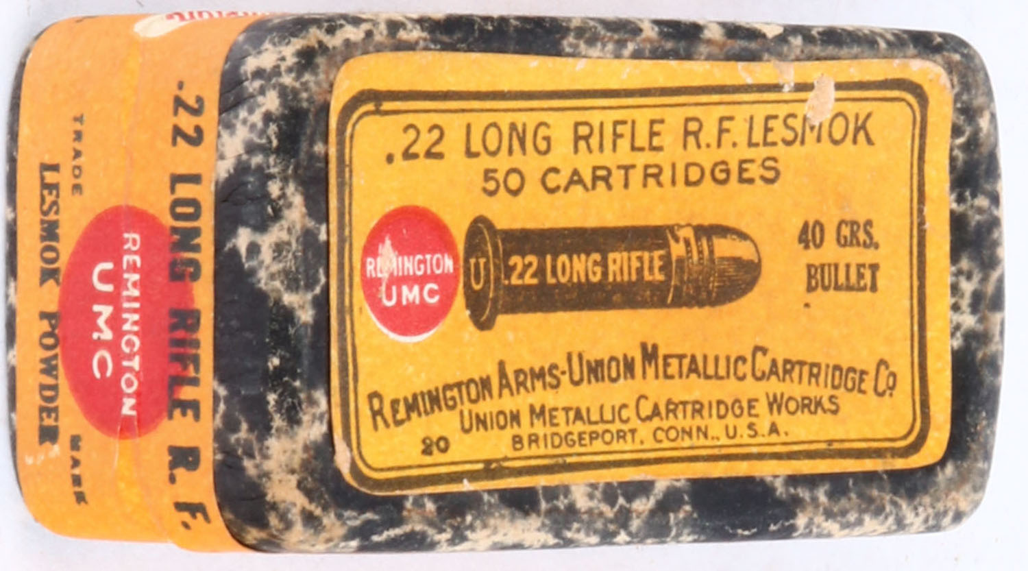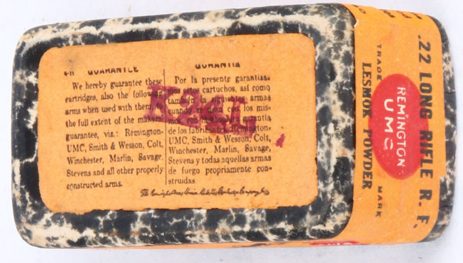 REM-UMC, R.F. Lesmok, .22 Long Rifle, RHWeb: REM-2 LR-1e, FULL & SEALED, 2pc. Black mottled box with orange top & side sealing labels, box is solid with excellent color, very minor chipping to top label, very minor corner wear, edges are crisp, labels are intact. Grade: Excellent ++ - Value: 30 to 90