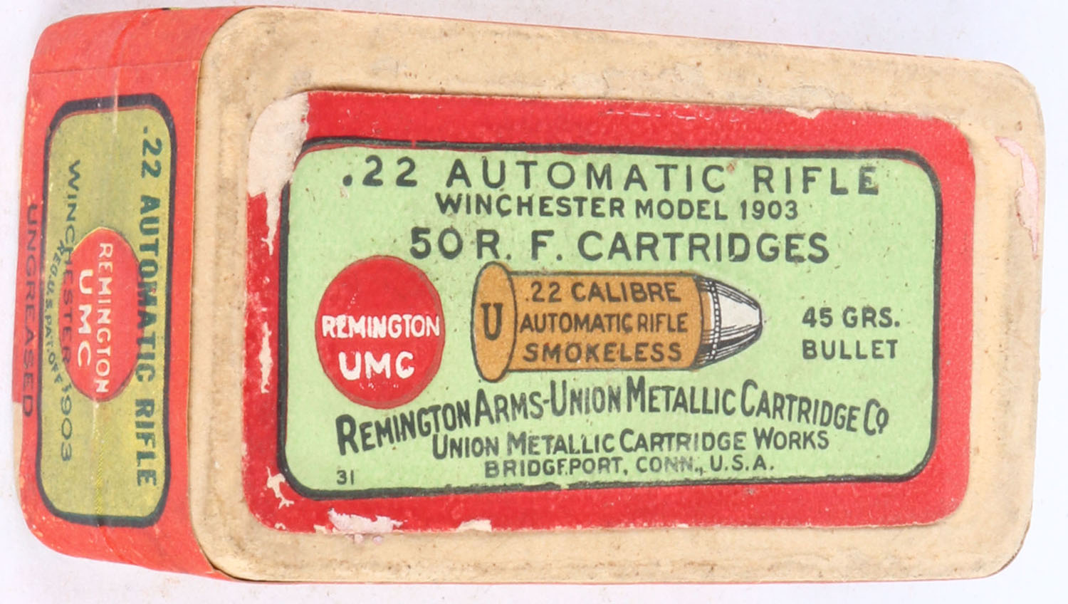 REM-UMC, .22 Winchester Automatic, Smokeless, RHWeb: REM-2 WA-1c, FULL & SEALED, 2pc. Buff box with green/red top & side sealing labels, box is solid with excellent color, very minor age soiling, very minor shelf wear, corners are mostly sharp, edges are mostly crisp, labels are intact. Grade: Excellent + - Value: 30 to 90