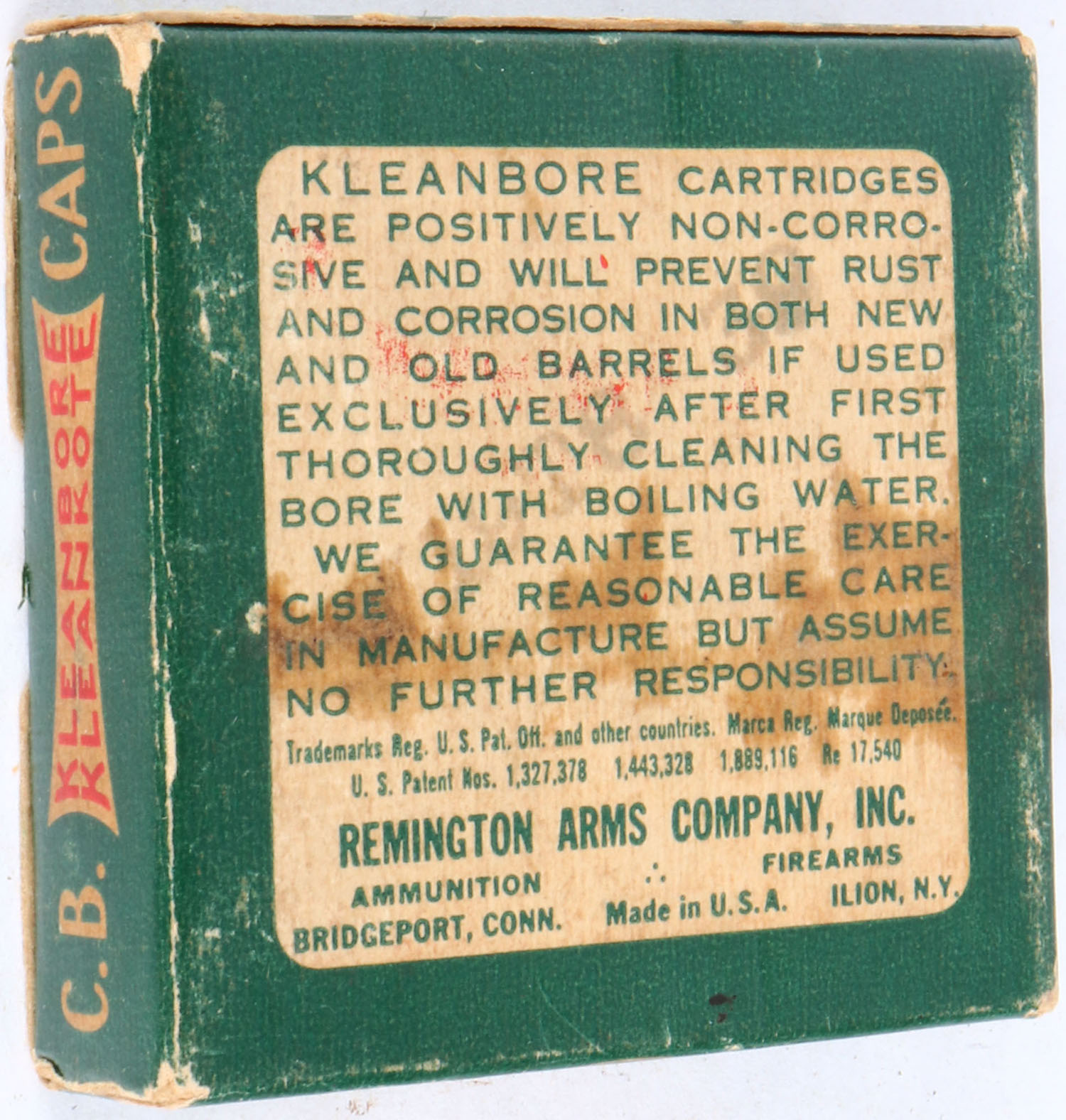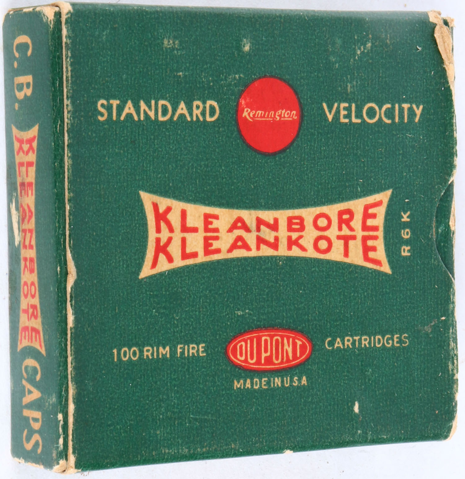Remington, Kleanbore Kleankote, .22 C.B. Caps, Standard Velocity, RHWeb: REM-9 CB-1d, Full, 1pc. Green white & red box, box is solid with excellent color, minor age soiling, some edge & corner wear, end flaps are solid, ammo is minty. Grade: Excellent - Value: 30 to 90