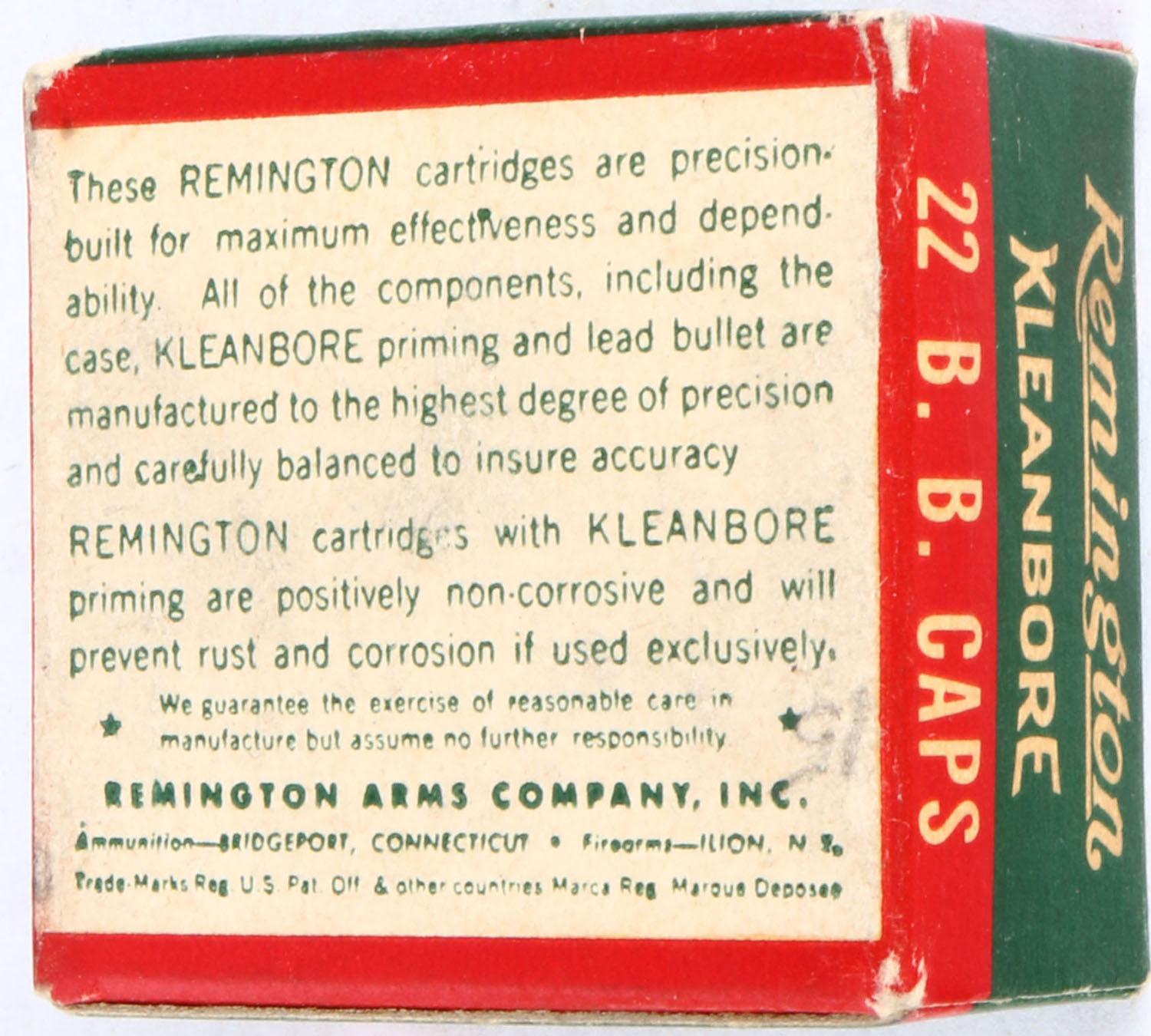 Remington, Kleanbore, .22 B.B. Caps, RHWeb: REM-12 BB-1b, Full, 1pc. Green white & red box, box is solid with excellent color, very minor age soiling & corner wear, edges are crisp, end flaps are solid, ammo is excellent. Grade: Excellent + - Value: 20 to 60
