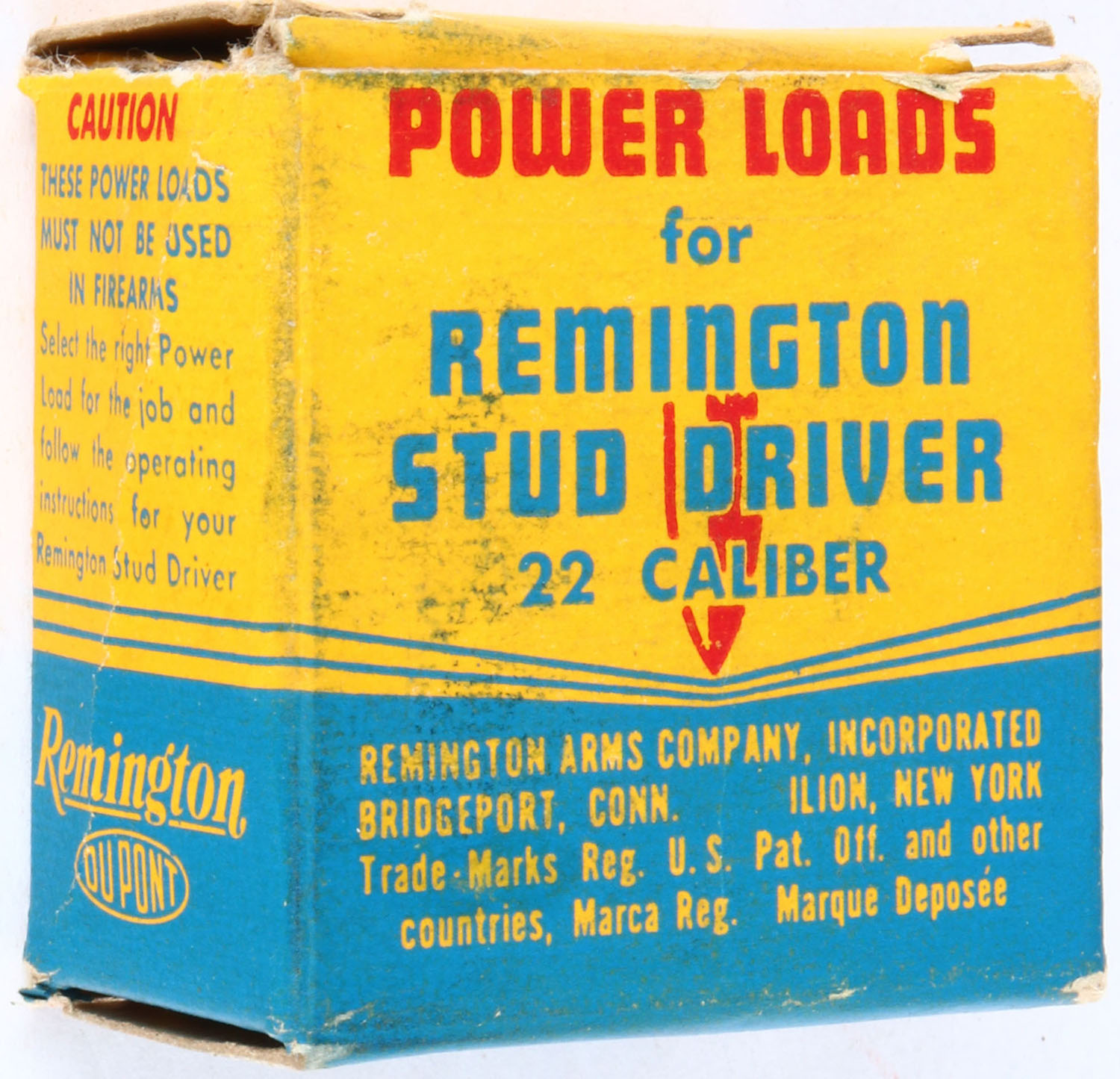Remington, Power Loads for Remington Stud Driver, .22 Caliber, Not in RHWeb, Full, 1pc. Yellow blue & red box, box is solid with excellent color, some age soiling & shelf wear, minor edge & corner wear, flaps are solid, ammo is excellent. Grade: Excellent - Value: 10 to 50