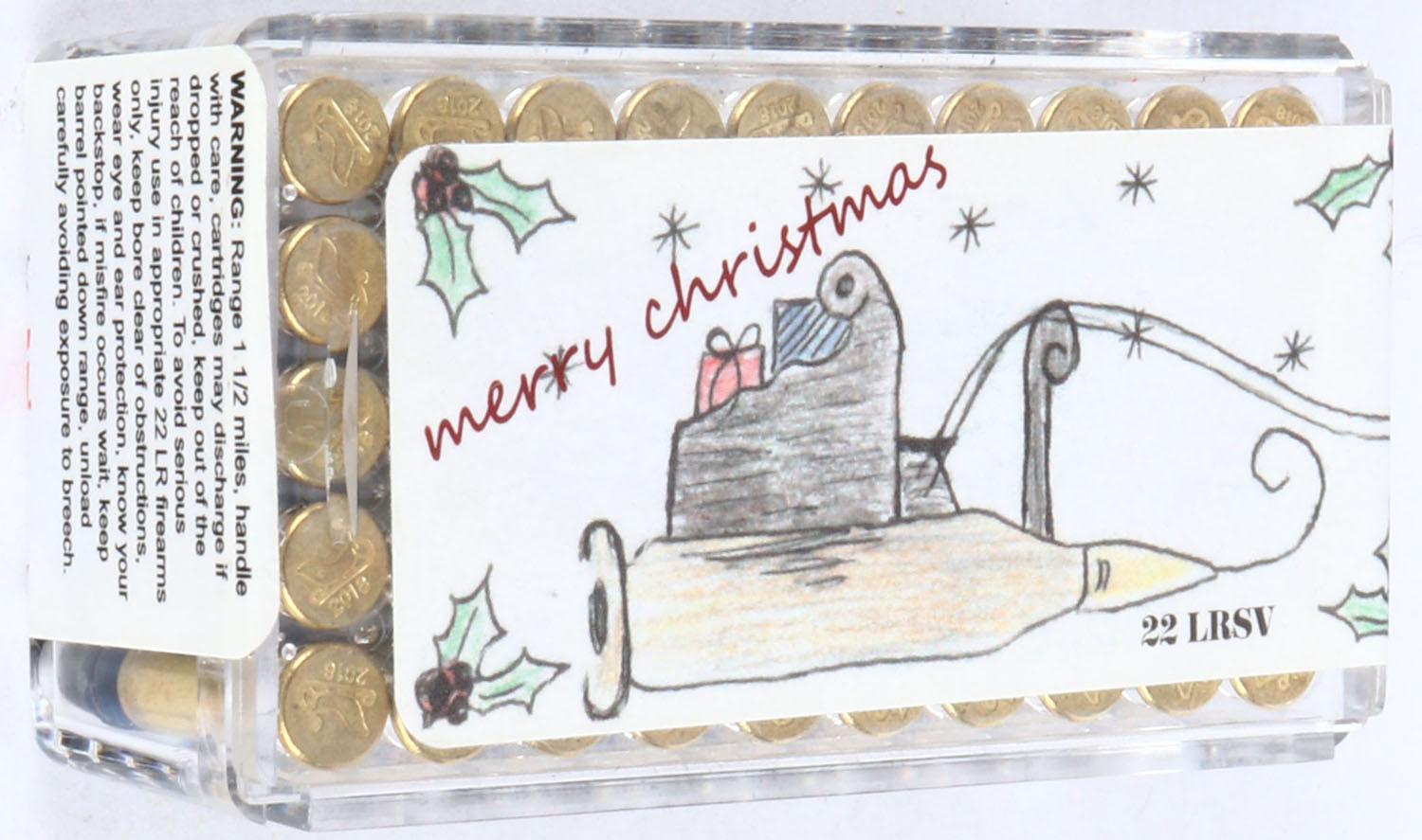 CCi, Merry Christmas 2018, .22 Long Rifle, Standard Velocity, RHWeb: CCI-19 LR-2018, Full & Sealed, 2pc. Clear plastic tray with label featuring a child's drawing of Santa's sled, plastic tray is clean & clear, label is intact with minty color. Grade: MINT - Value: 50 to 150