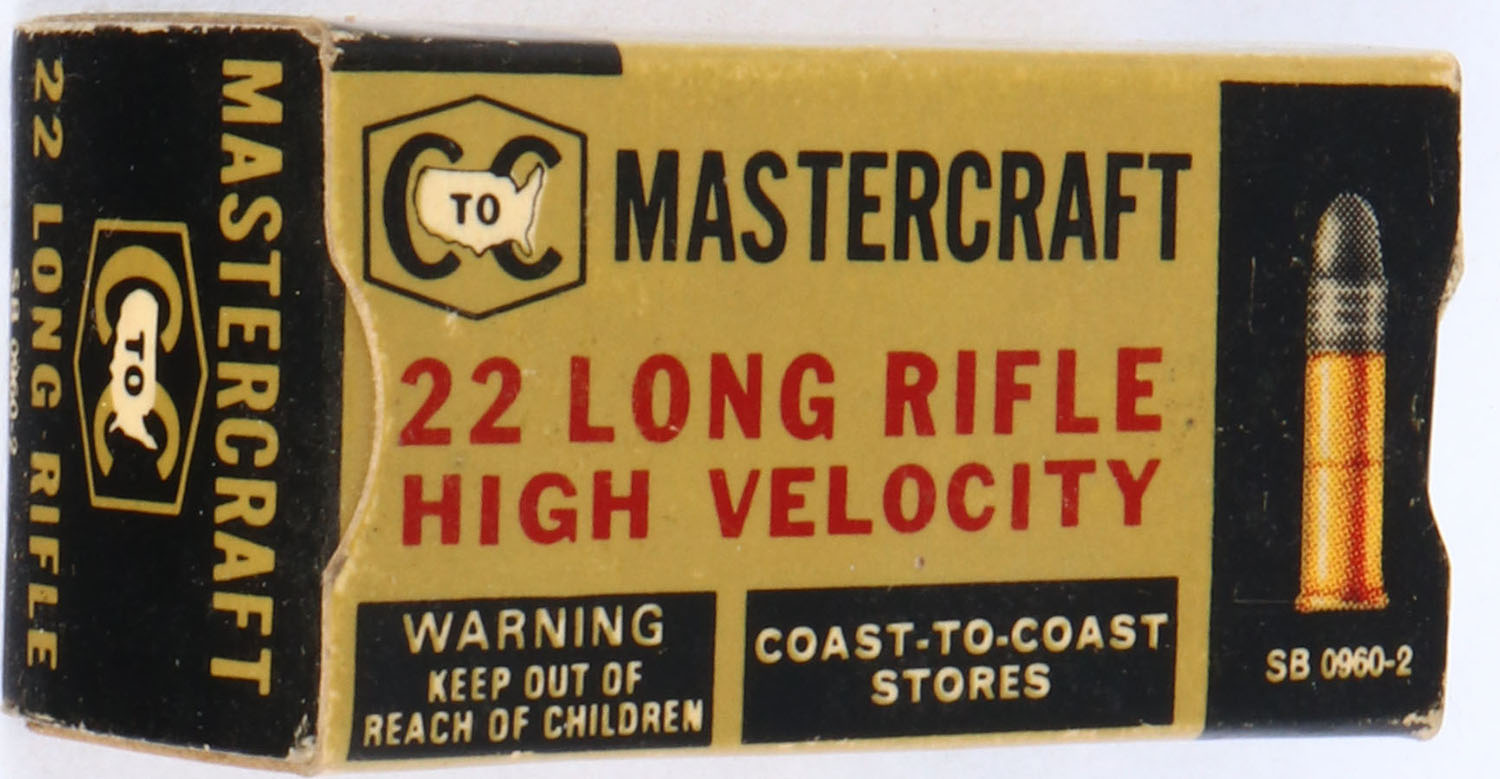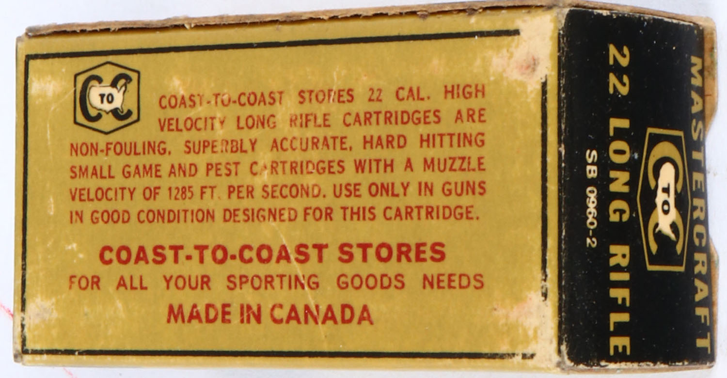 Coast to Coast, Mastercraft, .22 Long Rifle, High Velocity, RHWeb: CTC-1 LR-2b, Full, 1pc. Dull gold & black box, box is solid with excellent color, minor age soiling, very minor corner wear, edges are crisp, end flaps are solid, ammo is very good. Grade: Excellent + - Value: 6 to 30
