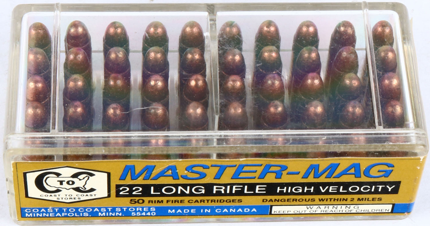 Coast to Coast, Master-Mag, .22 Long Rifle, High Velocity, RHWeb: CTC-2 LR-1.1, FULL & SEALED, 2pc. Clear plastic box with gold & blue side sealing label, box is solid with very minor shelf wear, label is intact with minty color. Grade: Excellent ++ - Value: 6 to 30