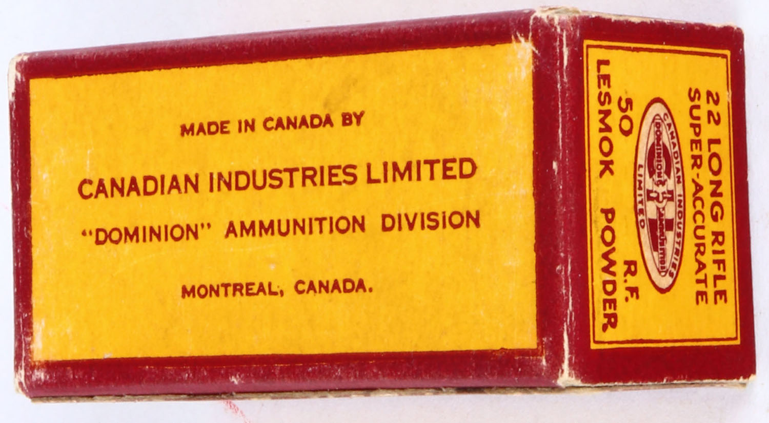 C.I.L., Super-Accurate, .22 Long Rifle, Lesmok Powder, RHWeb: CIL-2 LR-13, Full, 1pc. Yellow & maroon box, box is solid with excellent color, very minor age soiling & corner wear, edges are mostly crisp, end flaps are solid, ammo is very good to excellent. Grade: Excellent + - Value: 50 to 150