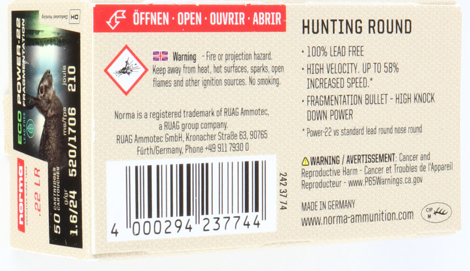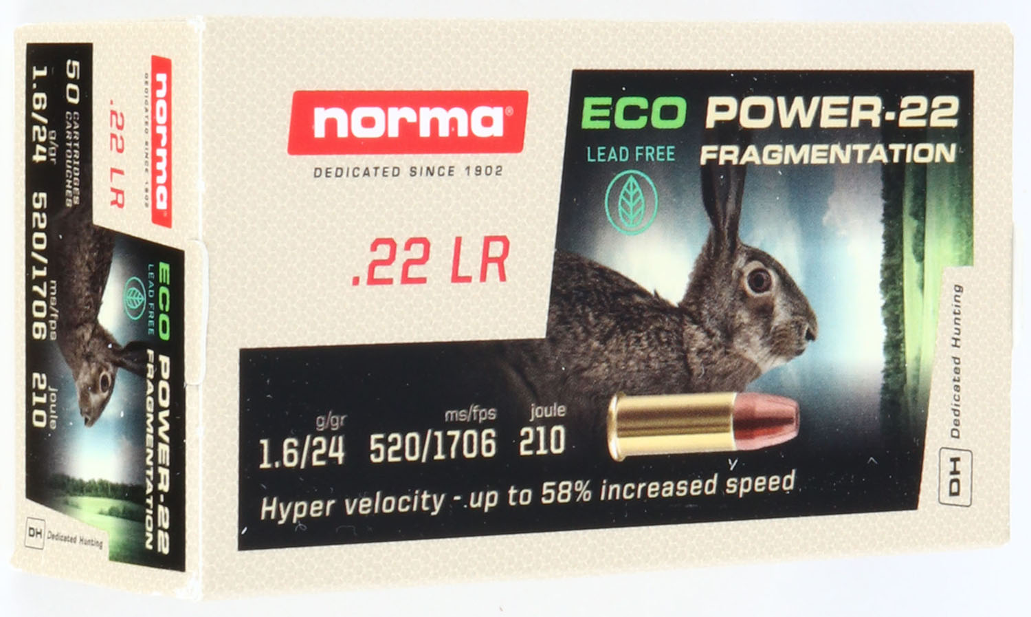 Norma, Eco Power-22, .22 Long Rifle, Lead Free Fragmentation, Hyper Velocity, Not in RHWeb, Full, 1pc. Tan box featuring a rabbit, box is near mint with mint color, only very minor corner wear, edges are crisp, end flaps are solid, ammo is mint. Grade: Excellent ++ - Value: 30 to 90
