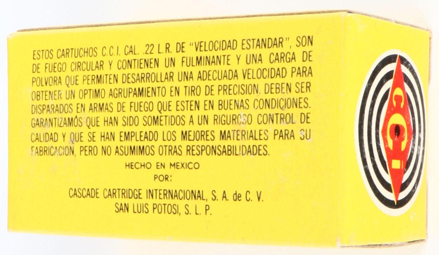 Cascade, Standard Velocity, .22 Long Rifle, Anticorrosive, RHWeb: MEX-CCI-2 LR-4a, Full, 1pc. Yellow black & red box, box is solid with excellent color, very minor shelf wear, corners are mostly sharp, edges are crisp, end flaps are solid, ammo is excellent. Grade: Excellent + - Value: 10 to 50