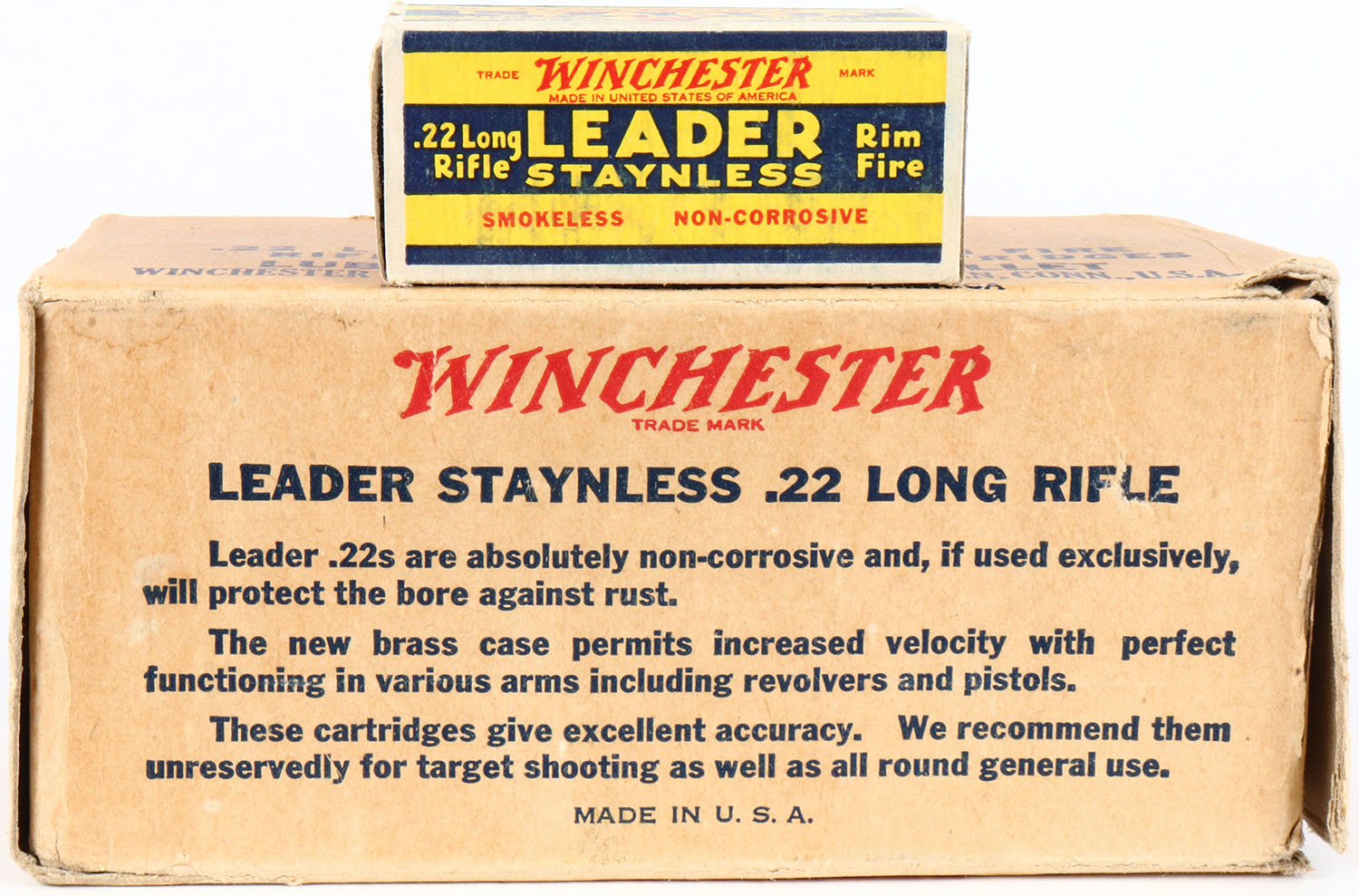 Winchester, Leader, .22 Long Rifle, Staynless, Full, 500rds., 1pc. Buff brick with blue & red printing, right end flap is torn brick has excellent color, very minor age soiling, corner wear, some edge wear, left end flap is solid, inside boxes are excellent. Grade: Very Good + - Value: 50 to 250