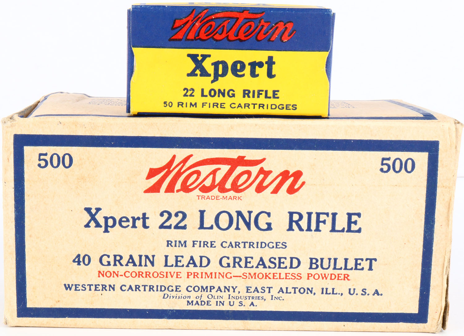Western, Xpert, .22 Long Rifle, Greased, Partial 9 boxes, 1pc. Buff blue & red brick, brick is solid with excellent color, minor age soiling & corner wear, edges are mostly crisp, end flaps are solid, inside boxes are minty. Grade: Excellent - Value: 40 to 120